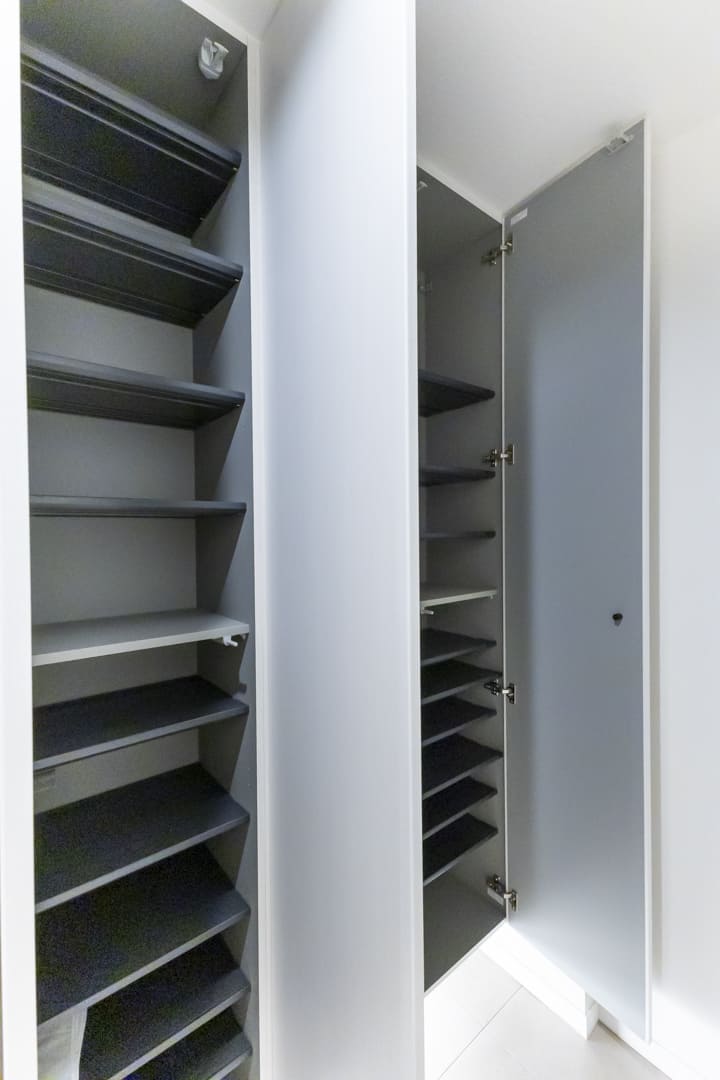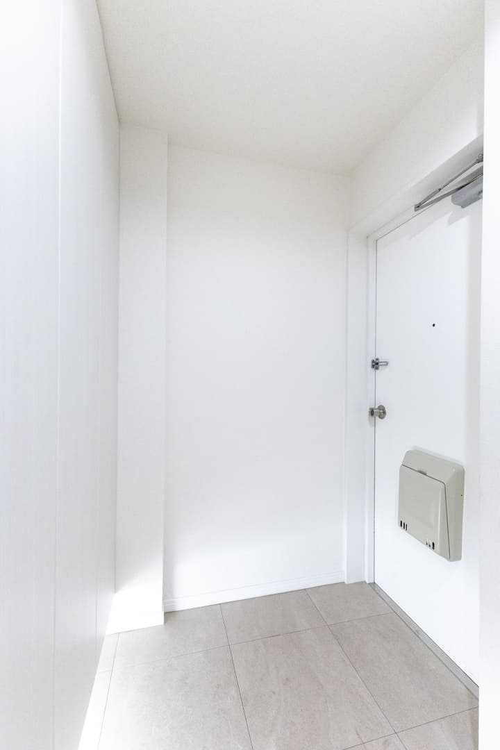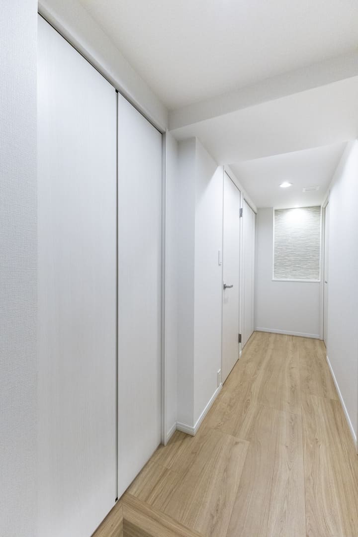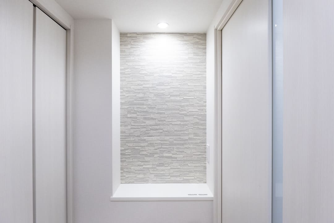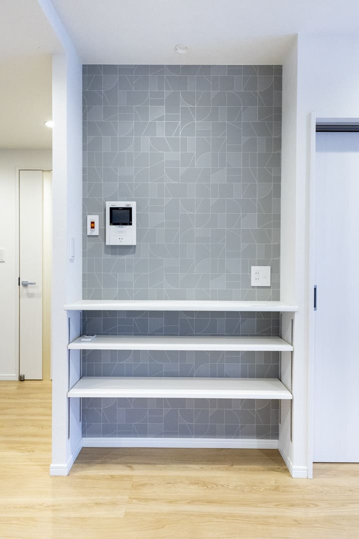 白を基調とした、明るく清潔感のある玄関。正面にはシューズボックスが備わっており、散らかりがちな靴もすっきり収納できます。足元をやわらかく照らすフットライトもポイント。廊下の突き当たりにはアクセントウォールをあしらったニッチカウンターがあり、小物やグリーンなどを飾ってインテリアを楽しめます。