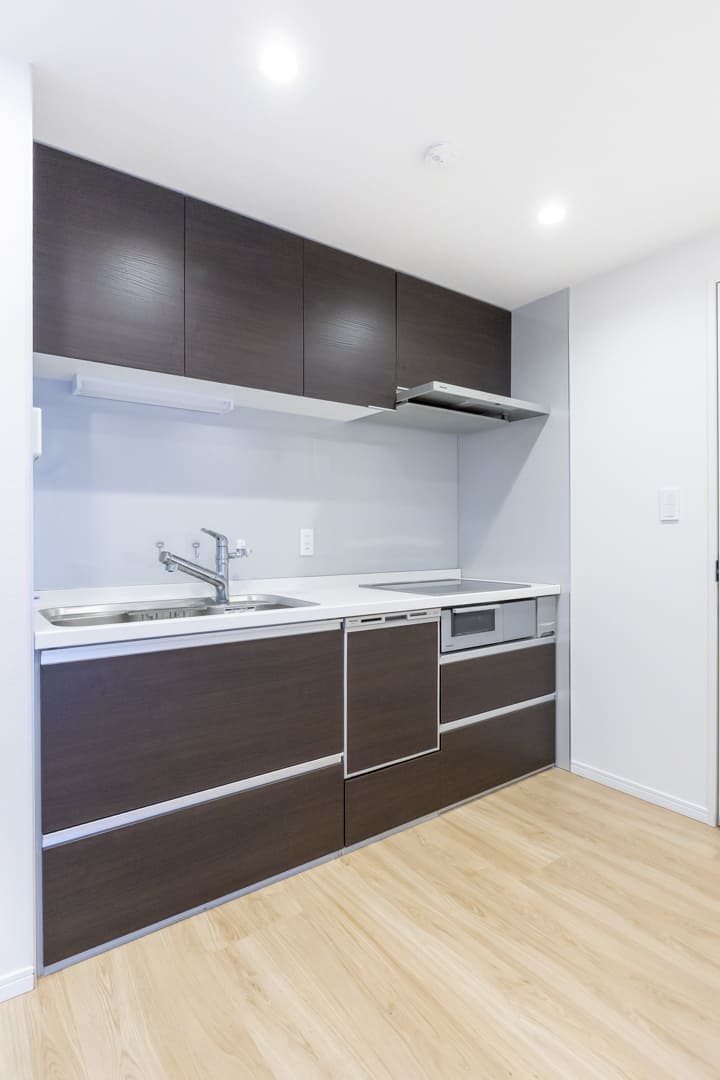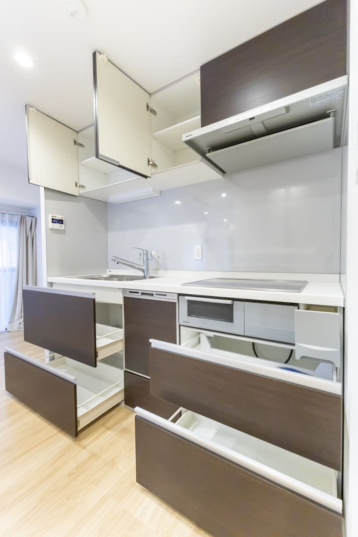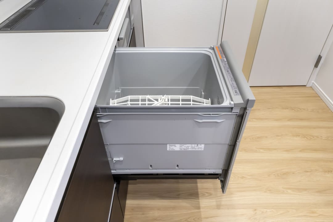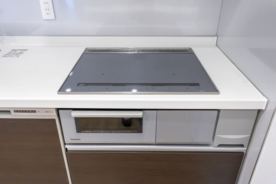 調理に集中しやすい壁付けキッチン。IHクッキングヒーターを採用しており、火力調整もスイッチで簡単に行えます。フラットな形状でお手入れしやすいのも魅力。食洗機も内蔵されているため、日々の後片付けもスムーズです。