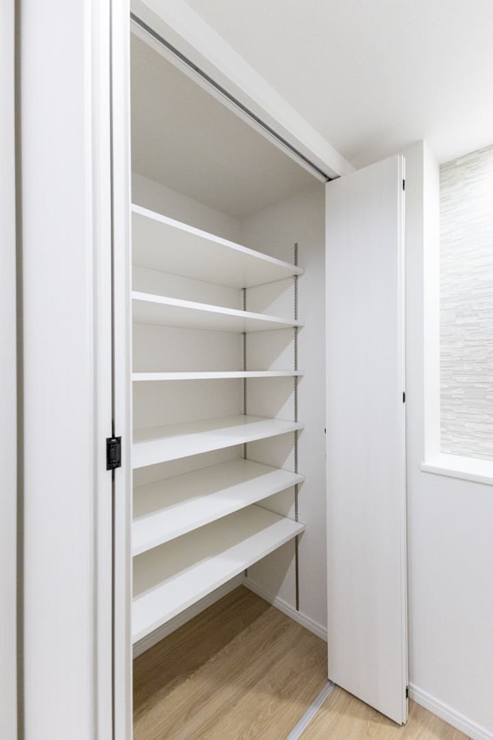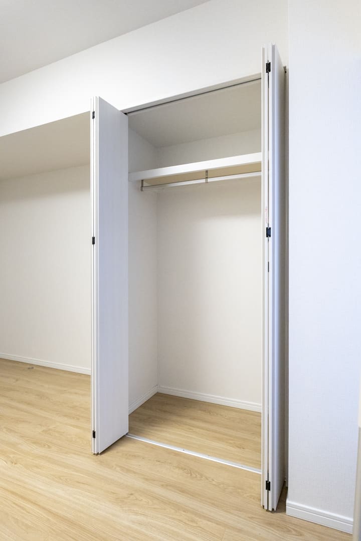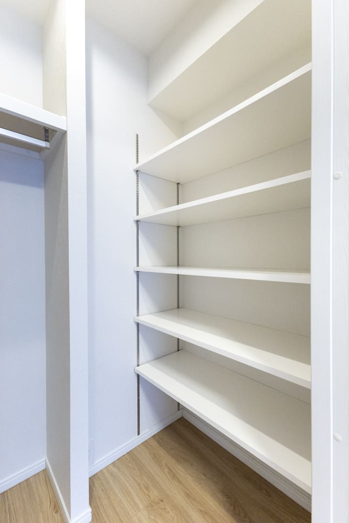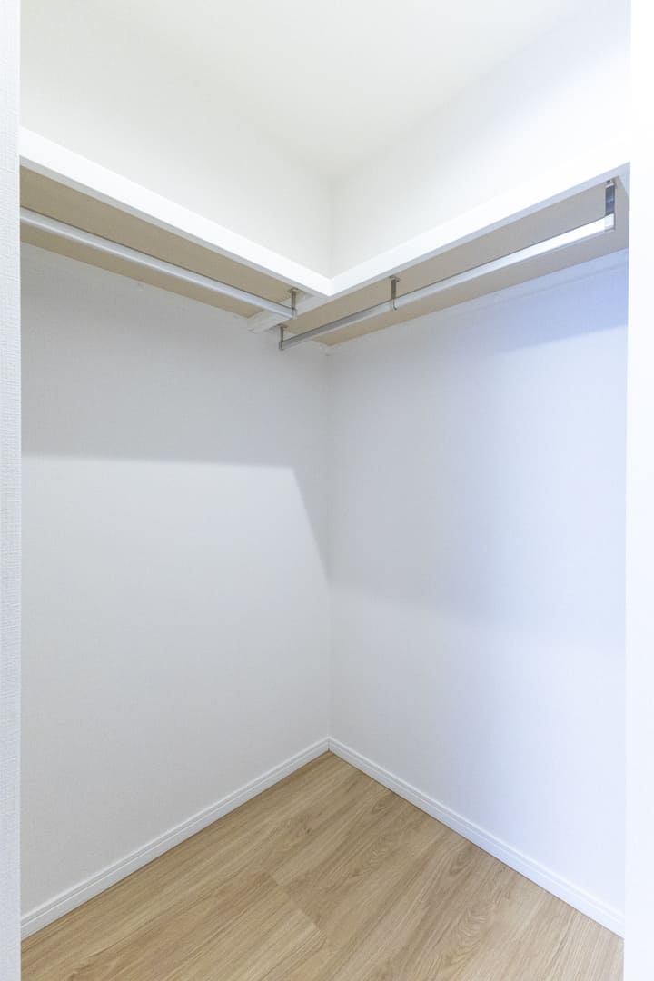 約1.4帖のWIC(ウォークインクローゼット)を備え、収納豊富。ハンガーパイプと可動棚を設置しており、洋服はもちろん小物類も整理しやすい仕様です。トランクケースや季節家電などの大きな荷物もすっきり収まり、居室空間を有効に活用できます。