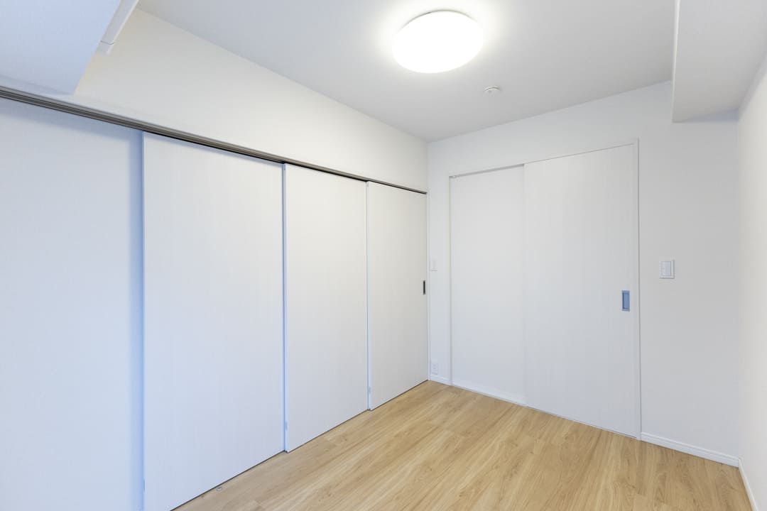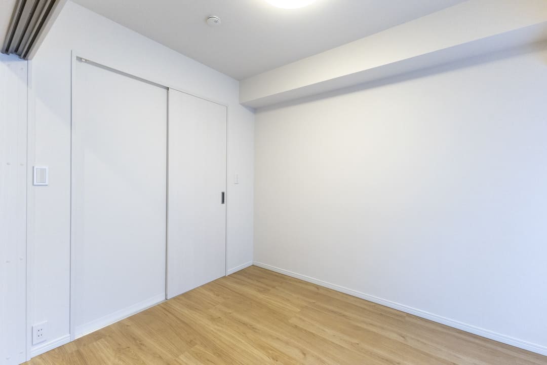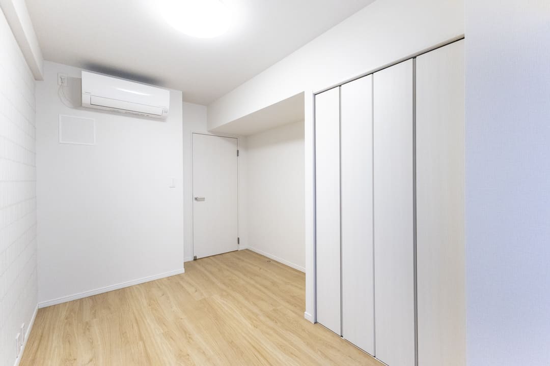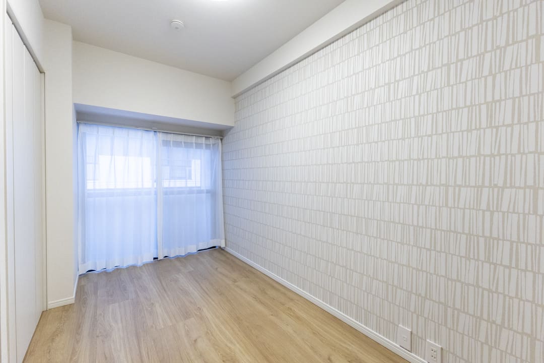 約5.7帖の寝室1。廊下に面した独立性の高い位置にあり、主寝室にもおすすめのお部屋です。アクセントウォールが空間のさりげないポイントに。バルコニーに面しており、奥行きと広がりを感じられます。4枚折れ戸のクローゼット付きで、収納スペースもしっかり確保されています。