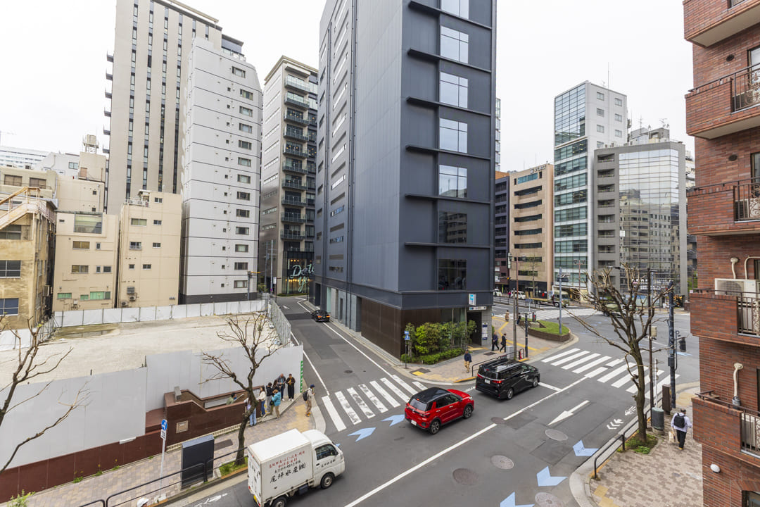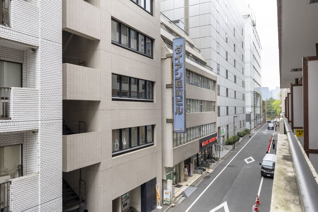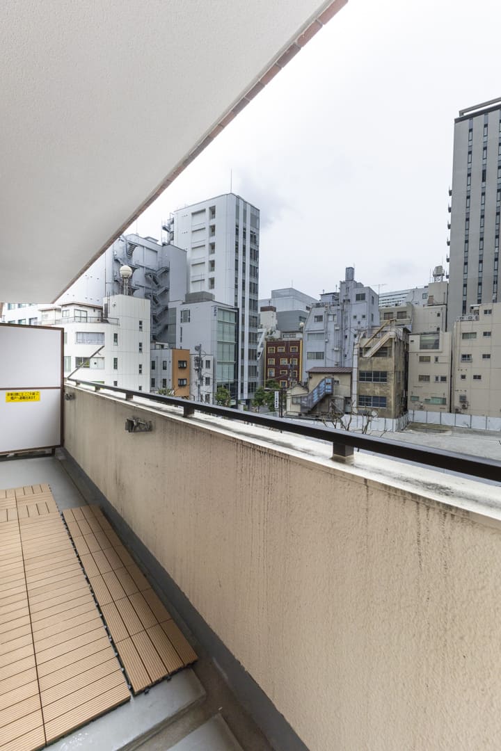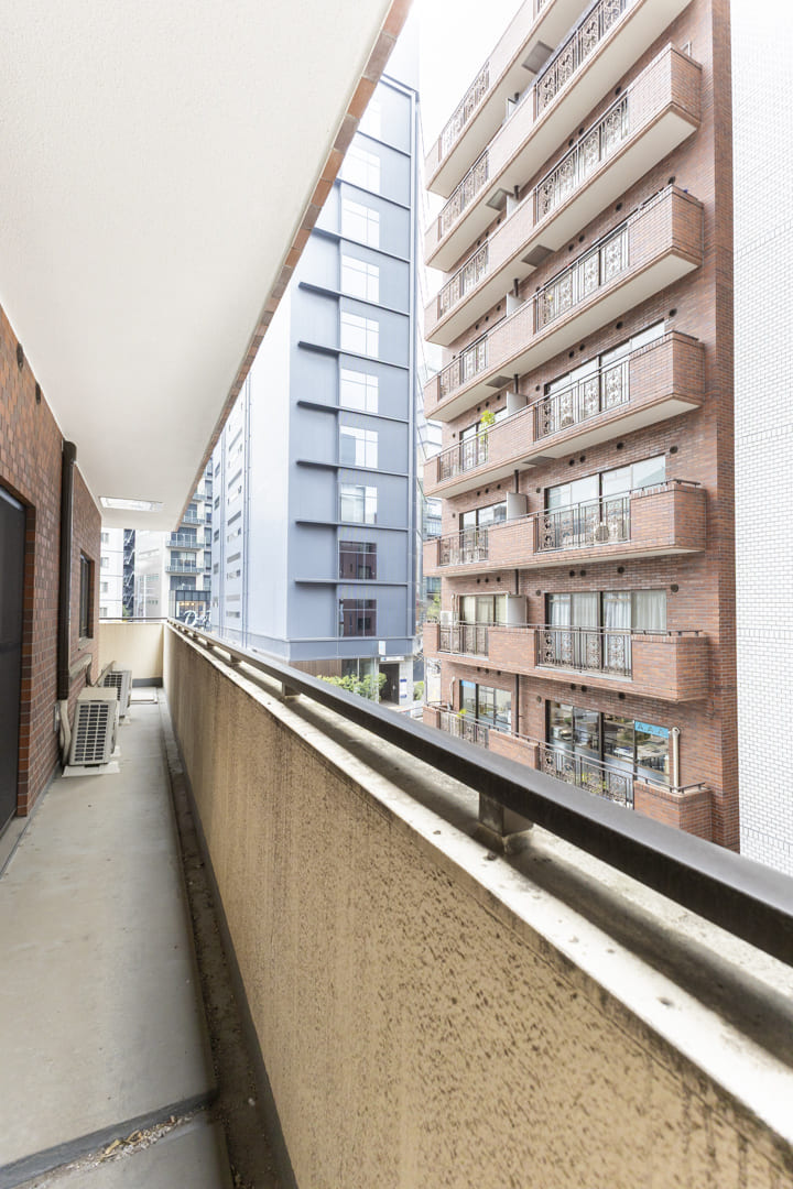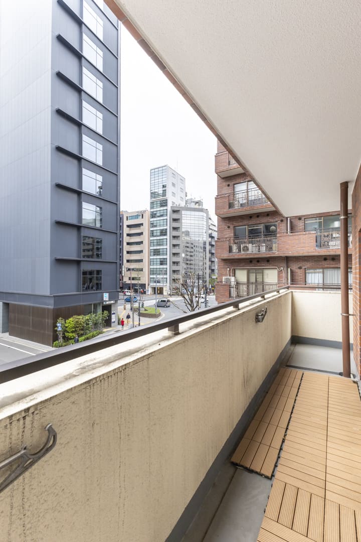 全居室に面するL字型バルコニー。広さは17.82㎡あり、ゆとりを感じられるスペースです。やわらかな光が届き、気軽に外の空気を感じられるのも魅力。周囲にはマンションやビルが並びますが、西側の視界は抜けており、視線もそれほど気にならなそうです。東側には、千鳥ヶ淵公園の緑が少し望めます。