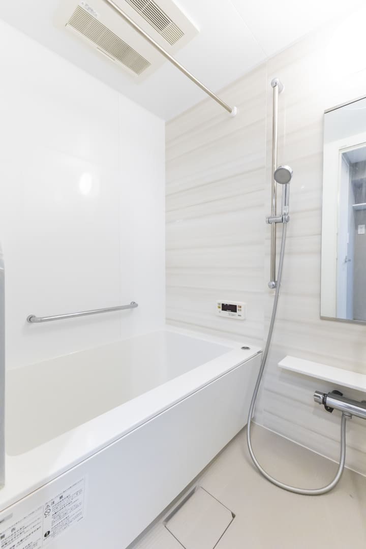 1216サイズのバスルーム。寒い日も快適に入浴でき、カビ対策や雨の日のお洗濯にも活躍する浴室換気乾燥暖房機を搭載しています。追い焚き機能も付いているので、家族の入浴時間がずれてしまった時、半身浴をしたい時に助かります。