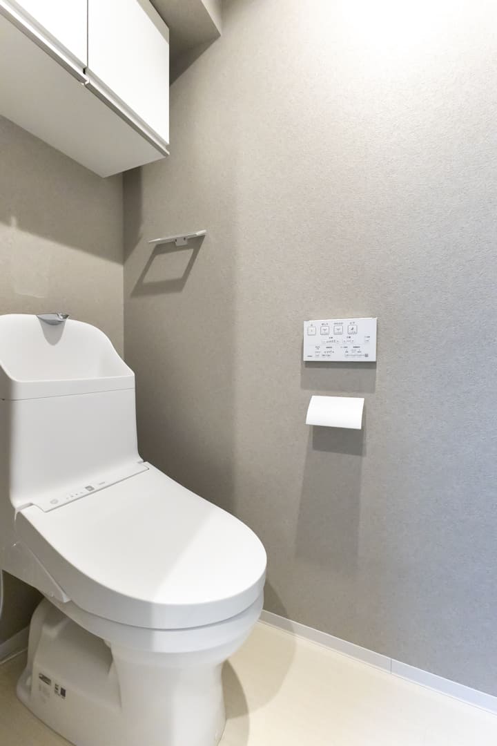 グレー系の壁紙を採用し、スタイリッシュな印象のレストルーム。TOTO製の洗浄機能付トイレを採用しています。洗面室内に配置されており、そのまま手洗いへとつながるスムーズな動線も魅力です。