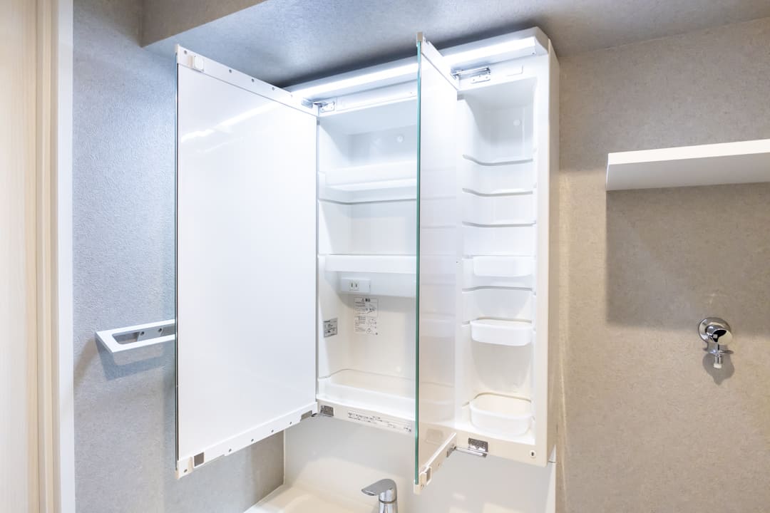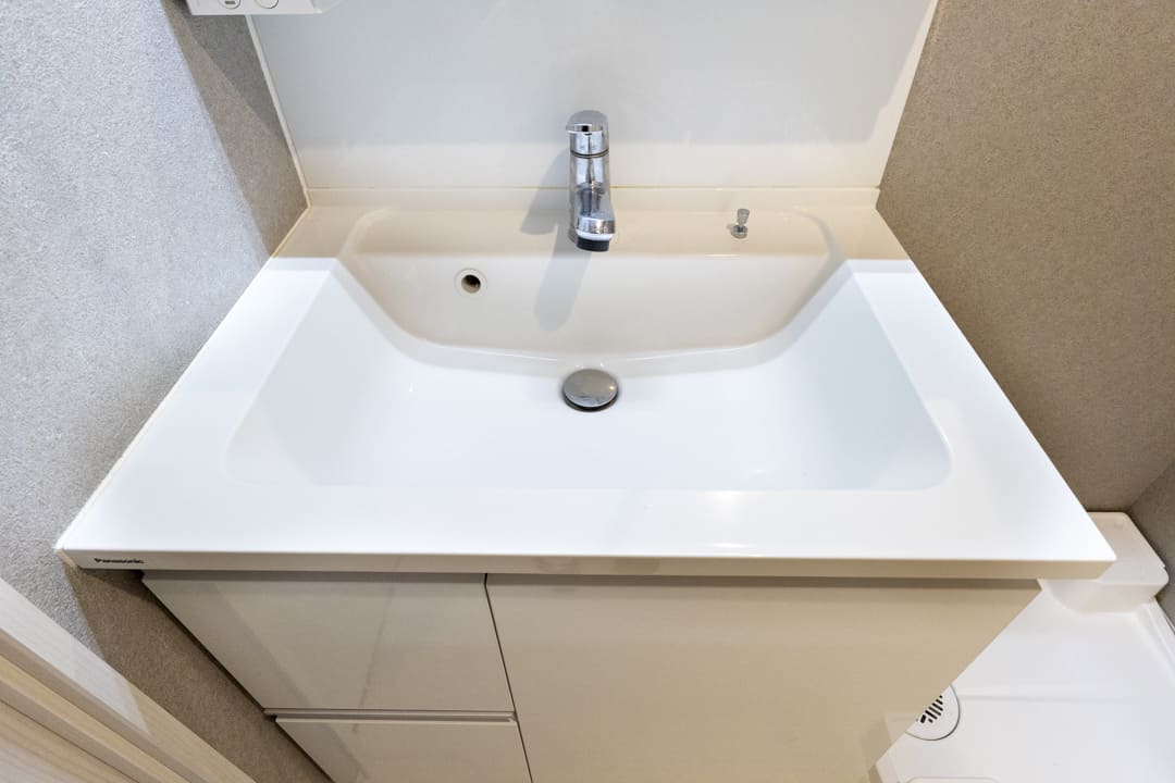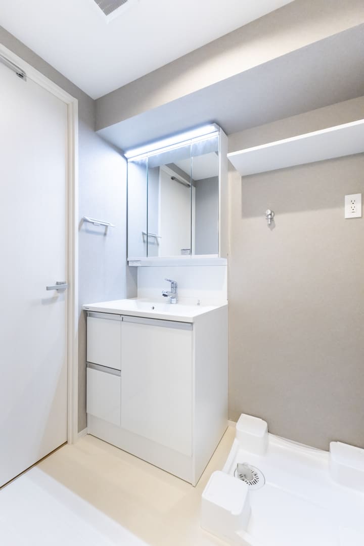 白基調で清潔感のある洗面化粧台。三面鏡付きで身だしなみを整えるのに便利です。洗面ボウルとカウンターに継ぎ目や隙間がないので、汚れが溜まりづらくお手入れ簡単。ミラーボックス内にはコンセントがあるため、電動歯ブラシやシェーバーなどを充電しながら収納可能です。散らかりがちな洗面まわりをすっきりと保てそうですね。