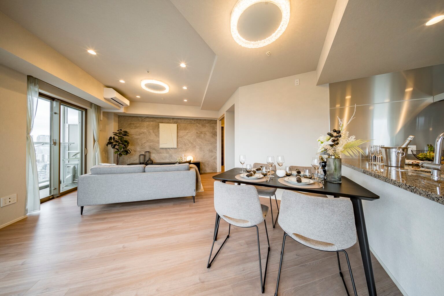 キッチンスペースを含め、約21.2帖のLDK。家族でゆったり過ごせる広さです。角部屋につき二面採光で開放感たっぷり。26階部の高層階につき室内からも見晴らしの良い景色が望めます。アクセントウォールにはピクチャーレールも設置されていて、壁にキズをつけずにアートや写真が飾れます。リビングの一角には収納スペースも設けられています。