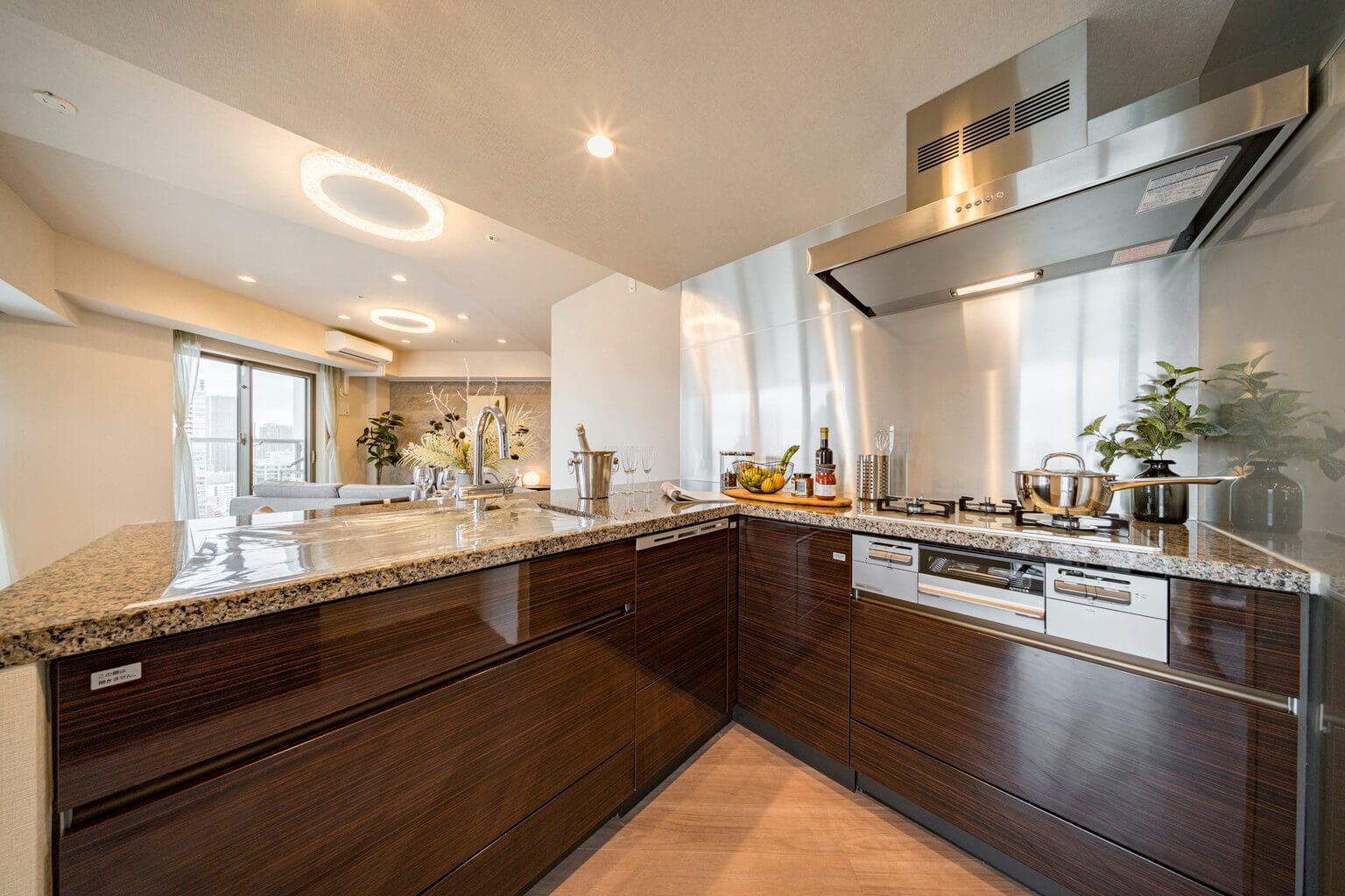 調理スペースが広々使えるL字型のシステムキッチン。天然石調のワークトップで重厚感のあるデザインが印象的です。シンク側はリビングと対面していて、家族やゲストとコミュニケーションが取りやすくなっています。小さなお子さんがいるご家庭では子どもの姿も見守れますね。