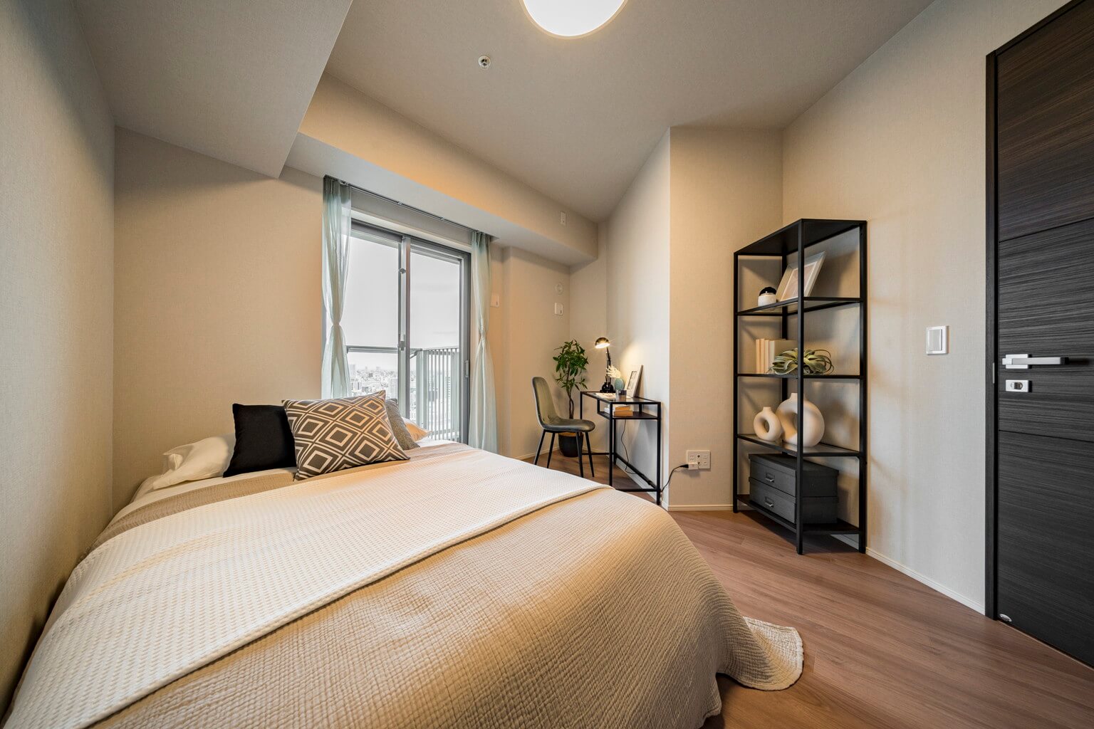 約6.5帖の洋室1。廊下に面した独立性の高い空間で、自分時間をゆっくりと過ごせます。朝の優しい光が感じられる北東向きで、バルコニーも付いています。WIC(ウォークインクローゼット)も設置されていて、洋服がたっぷり収納できます。