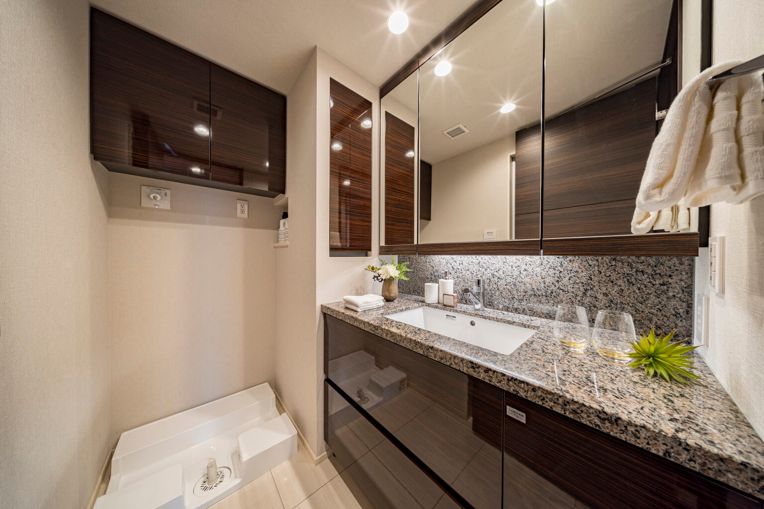 天然石調のカウンターでホテルライクな重厚感のある洗面化粧台。洗面まわりの小物がすっきり整頓できるミラーボックスや、モノの出し入れがしやすい引き出し式のキャビネット付きで使い勝手の良さもポイントです。