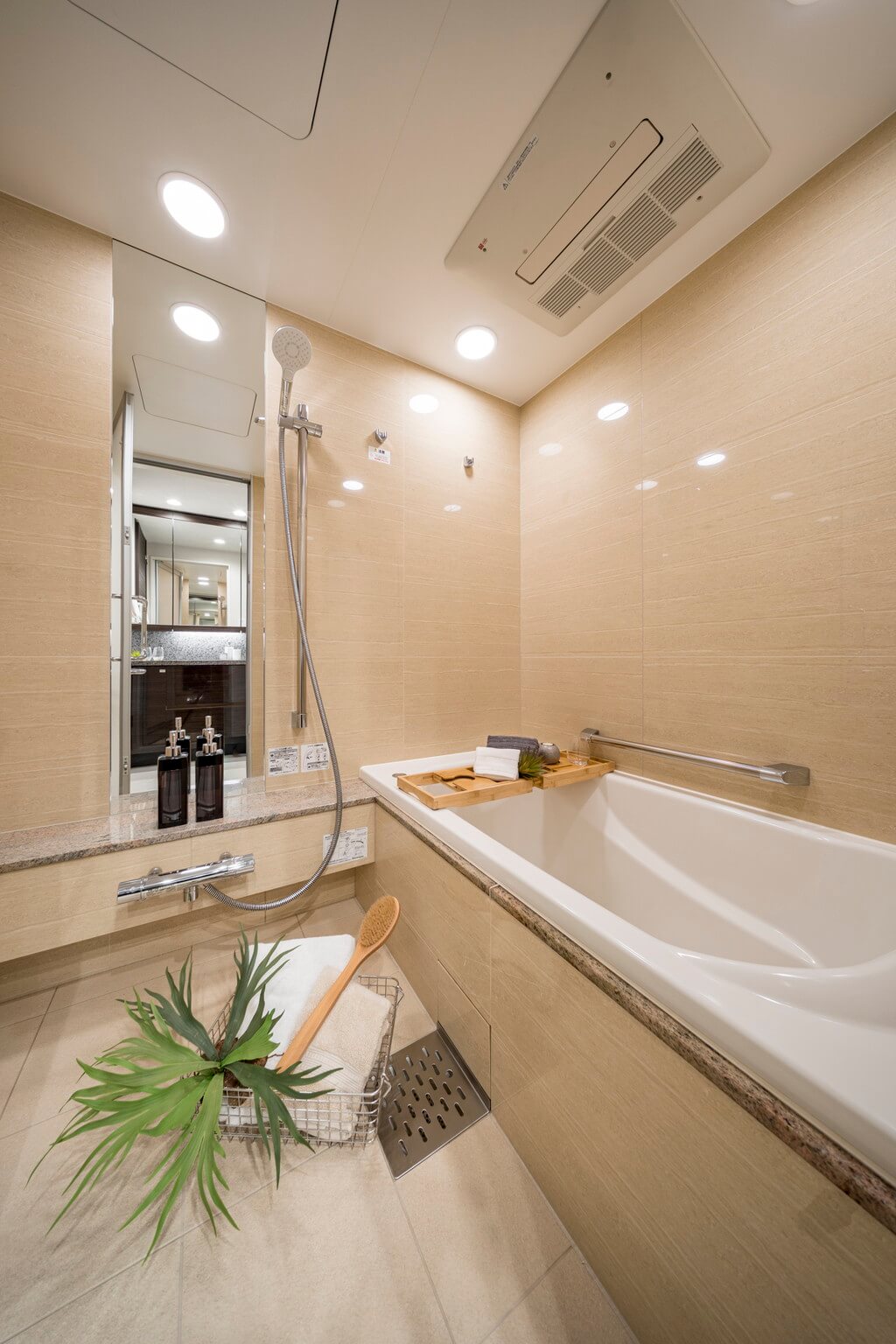 ベージュトーンで統一された品のある雰囲気のバスルーム。追い炊き機能の他、浴室換気乾燥機が備わっています。