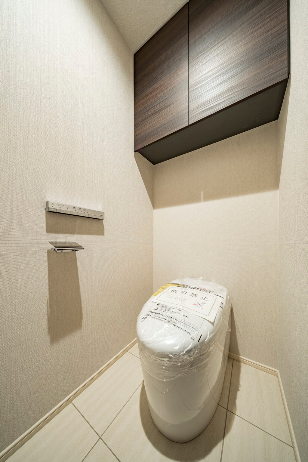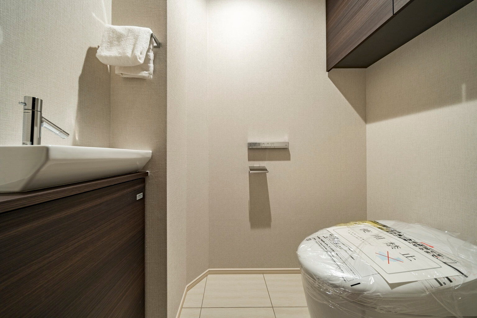 廊下に面したレストルーム。空間がすっきり見えるタンクレストイレです。独立型の手洗器、ウォシュレット、収納スペースも付いています。