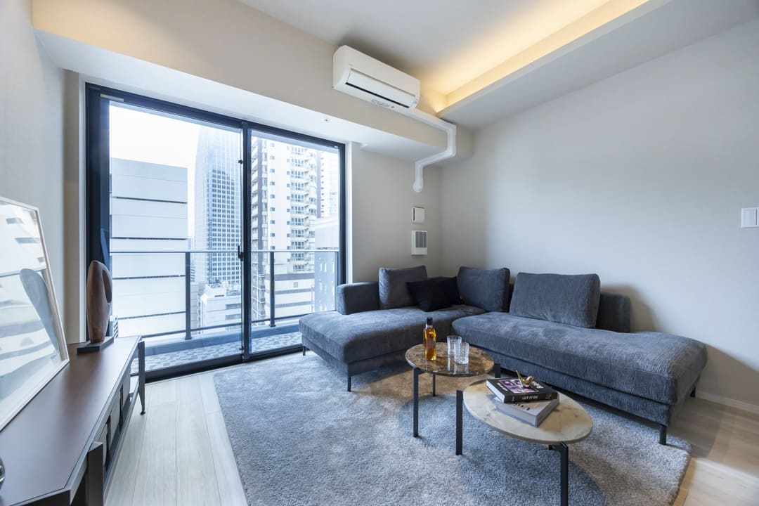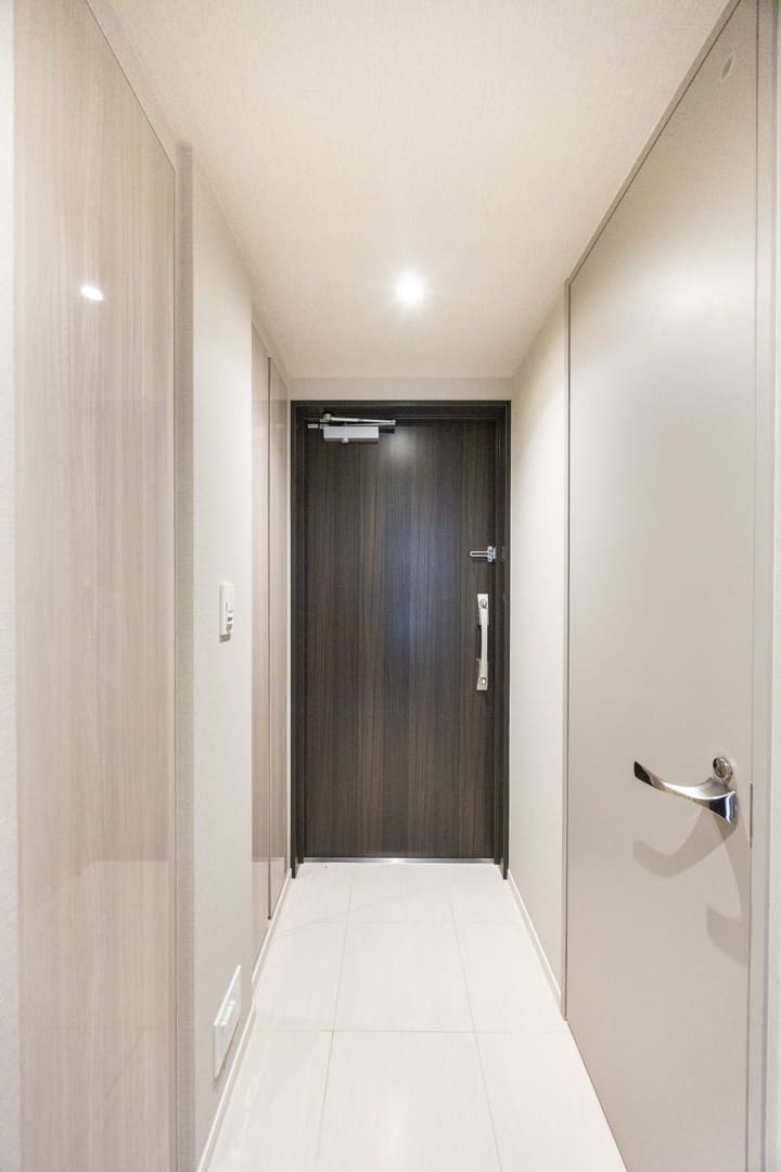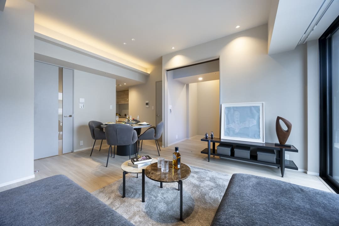 東京メトロ日比谷線「虎ノ門ヒルズ」駅より徒歩5分。駅からのアクセスに優れた場所に建つ、築年数の浅いレジデンスです。エントランスはブラックを基調に、直線的なライン照明が印象的で、都市のホテルや商業施設を思わせるスタイリッシュなデザインが広がります。お部屋は2LDKの間取りで、カップルや二人暮らしのライフスタイルにもなじみやすい設計。天井高約2,700㎜の開放的な空間に加え、南西向きのためやわらかな自然光が室内に広がります。さらに、専用トランクルームが備わっており、日用品や季節物の収納にも対応。日々の暮らしやすさに配慮された住まいです。