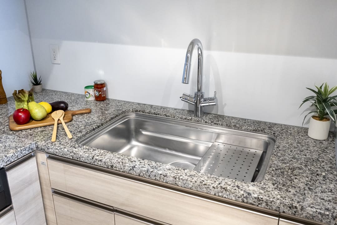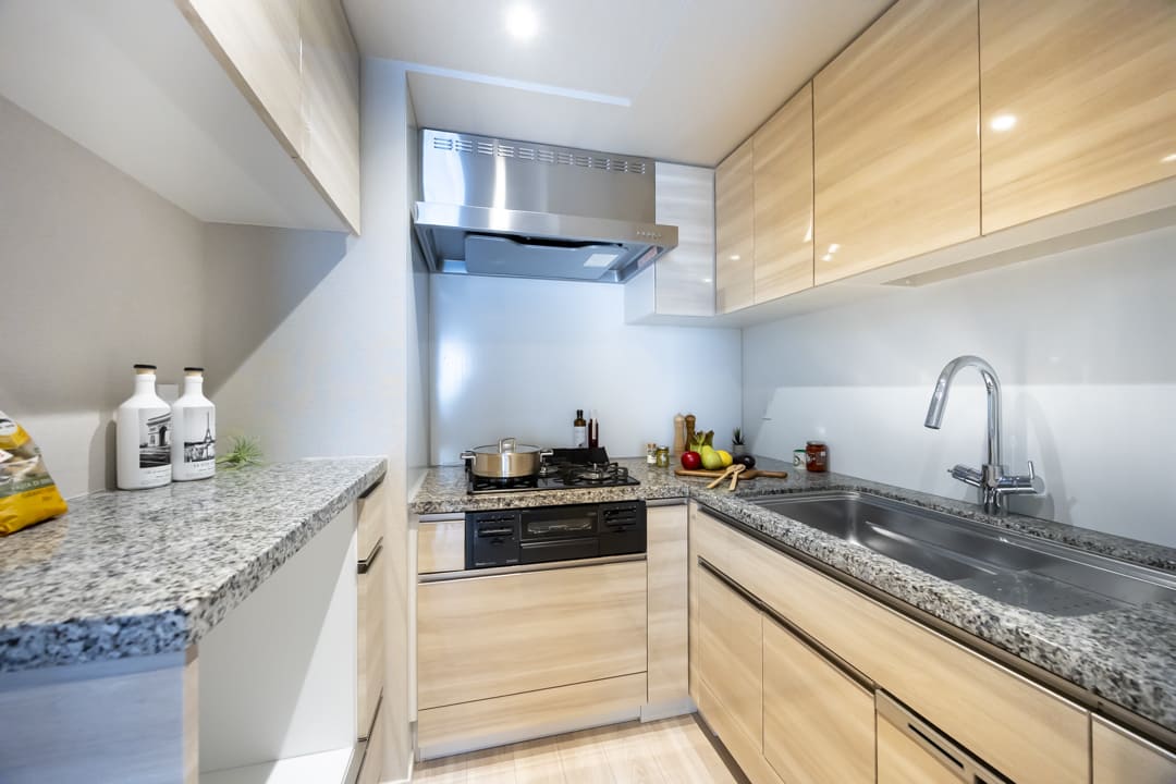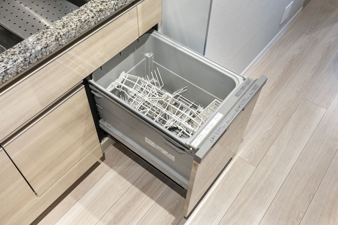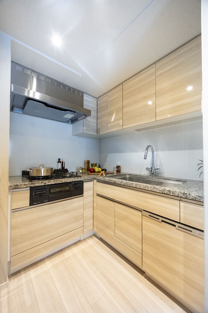 キッチンは、動線が最小限に済んで料理が捗るL型を採用。作業スペースや収納スペースも広めに取れて使い勝手良好です。また、3口コンロ、グリル、食洗機付きと設備面も充実しています。