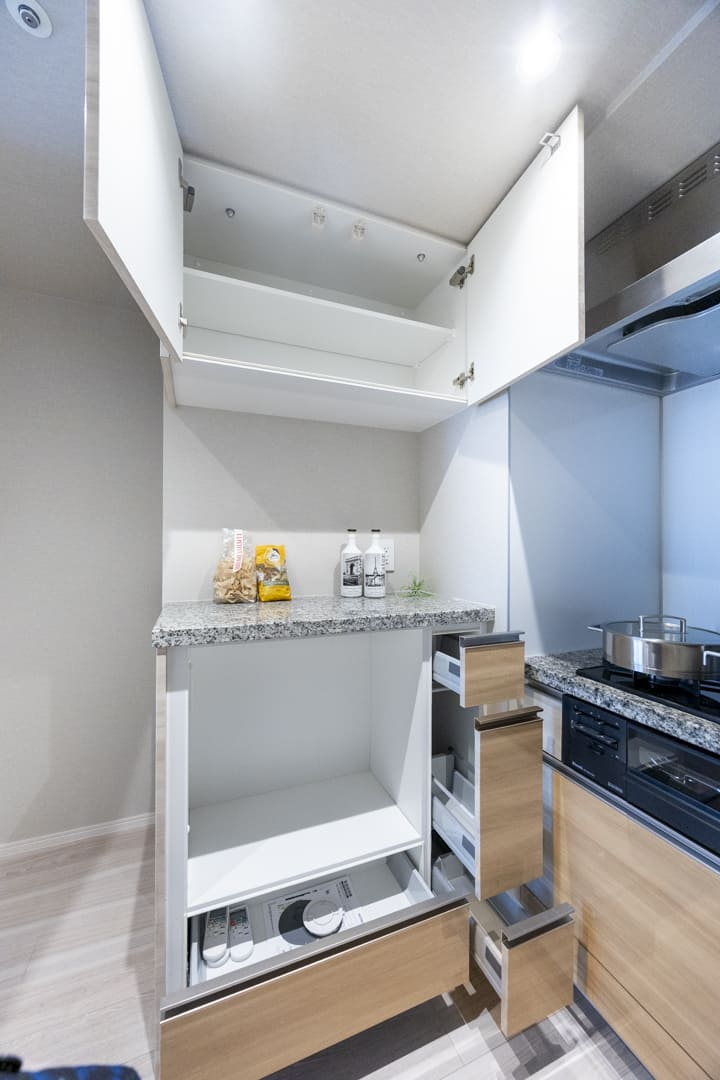 キッチンの背面側にはカップボードが備え付けられています。調味料や食器などを収納できるだけでなく、電子レンジなどを置くこともできるので便利です。
