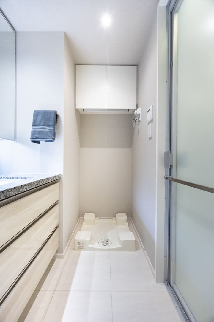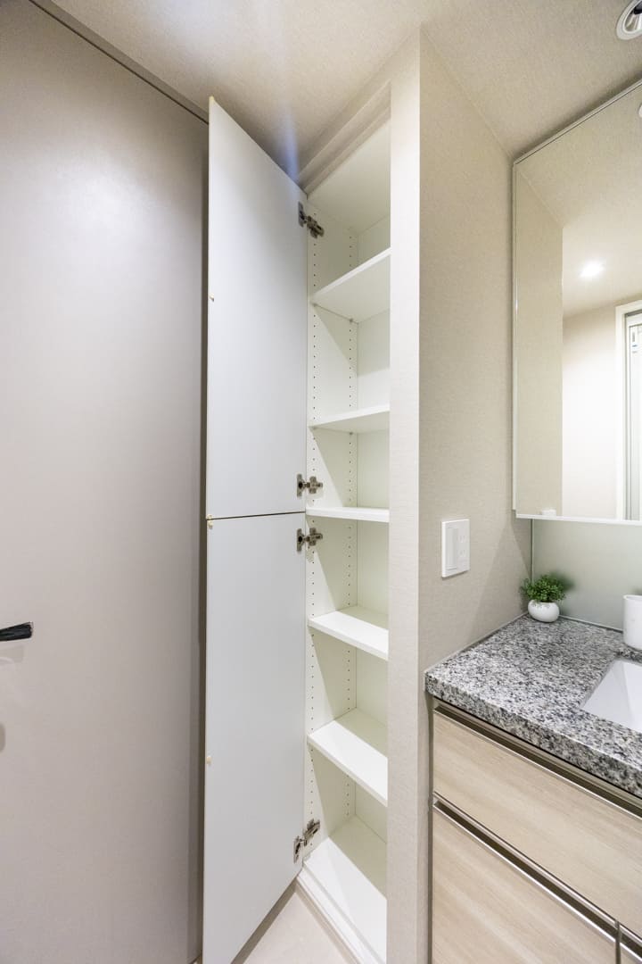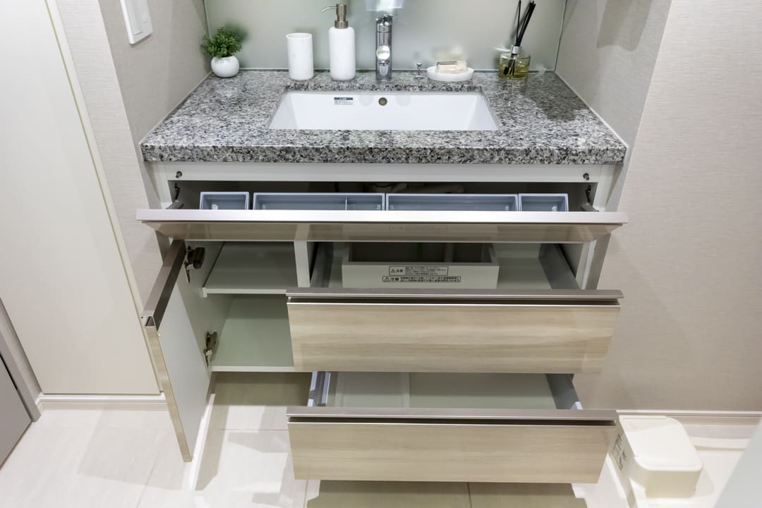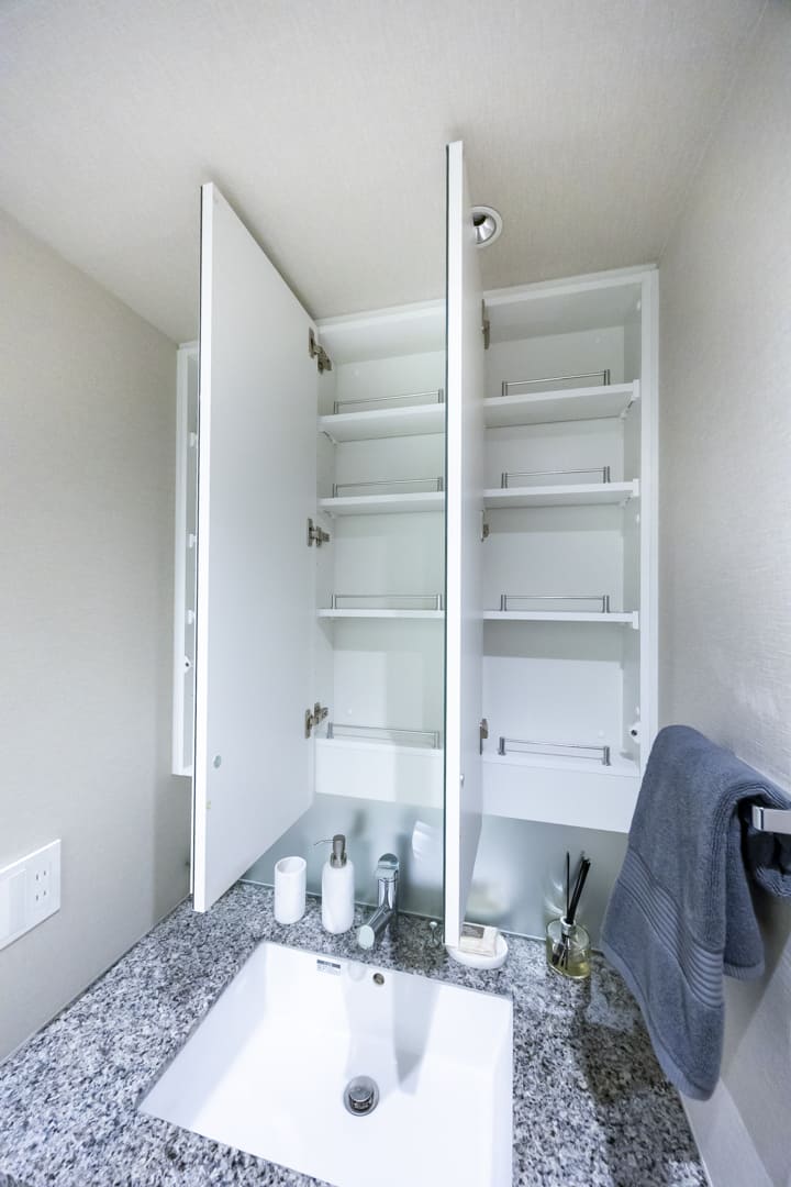 石目調のカウンターで高級感がある洗面化粧台です。三面鏡の中には化粧品などが収納できて使い勝手良好。引き出しも小物が収納しやすくなっていて◎。横にはリネン庫が造られているので、ごちゃごちゃしがちな洗面まわりをきちんと整頓させることができます。