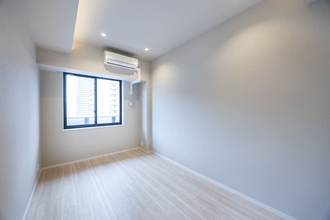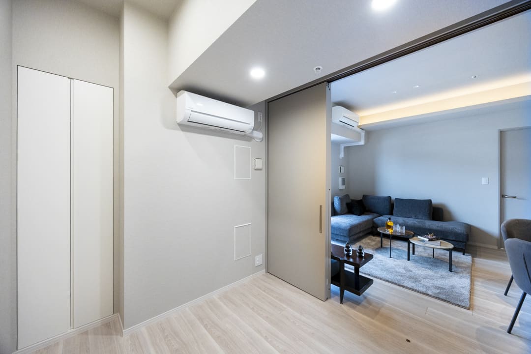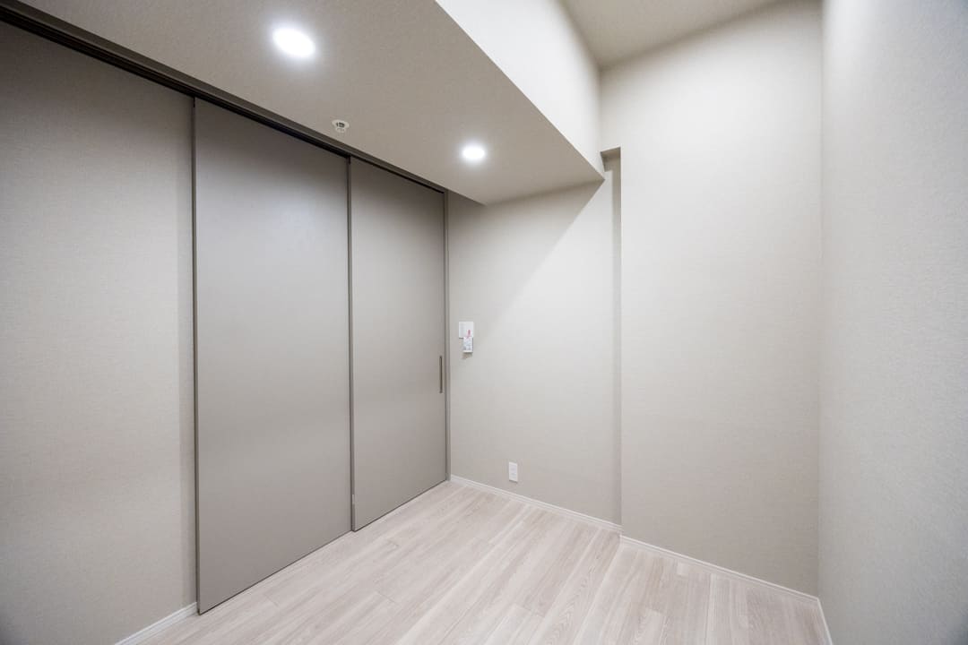 リビングダイニングに隣接している約4.5帖の寝室です。引戸を開閉することによって、空間をフレキシブルに使うことができます。また、窓はありませんが、外の明るさや天候に左右されにくいため、落ち着いた環境で物事に集中しやすい空間となっています。クローゼットが備わっているため収納にも困らず、書斎や趣味部屋、リモートワークスペースとしても活用しやすいのが魅力です。