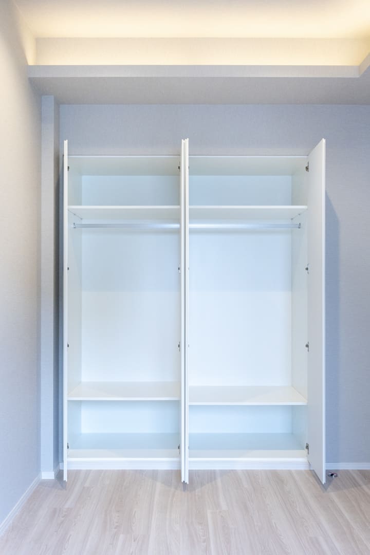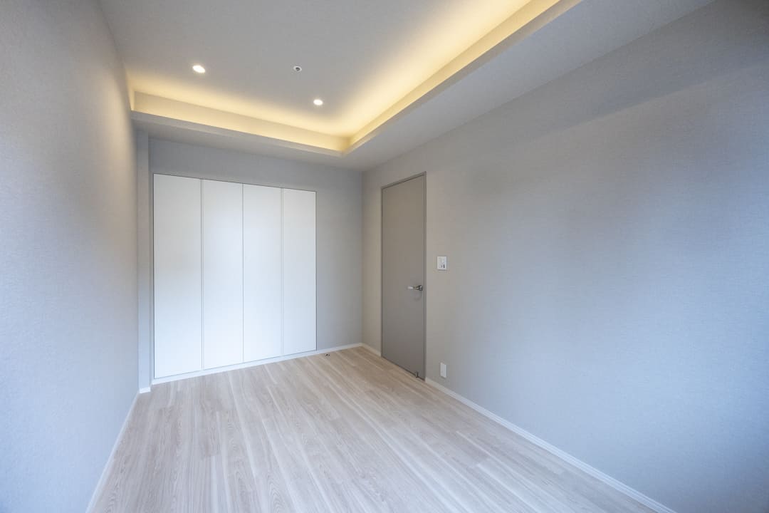 約6.5帖の主寝室は、マンション特有の大きな梁がなく、家具のレイアウトがしやすそうなお部屋です。間接照明も相まって洗練された雰囲気が漂っています。また、奥行きがあるクローゼットが付いているので、収納スペースも確保されています。