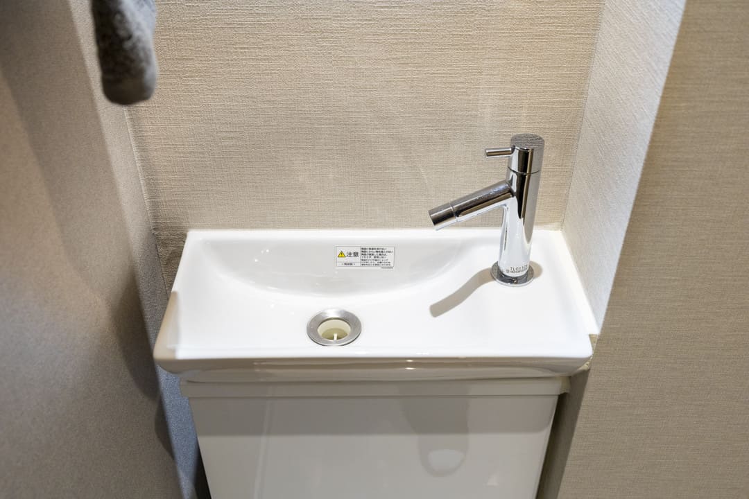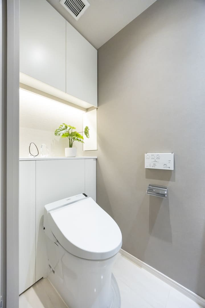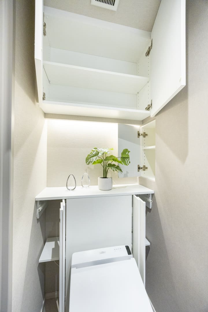 ウォシュレット一体型のトイレです。タンクレスタイプなのですっきりとした印象に。また、別途で手洗い器が造られているので、すぐに手を洗うことができて衛生的です。背面には吊戸棚が設置されていて、収納スペースもありますよ。カウンタースペースにはアロマなどを置いても◎。
