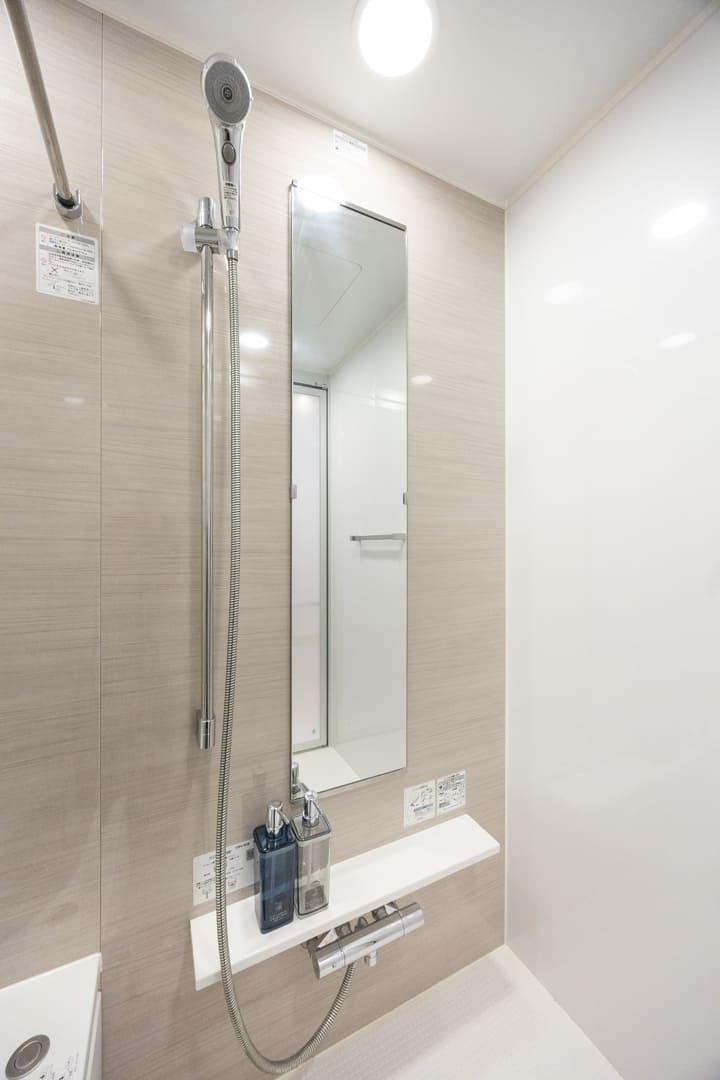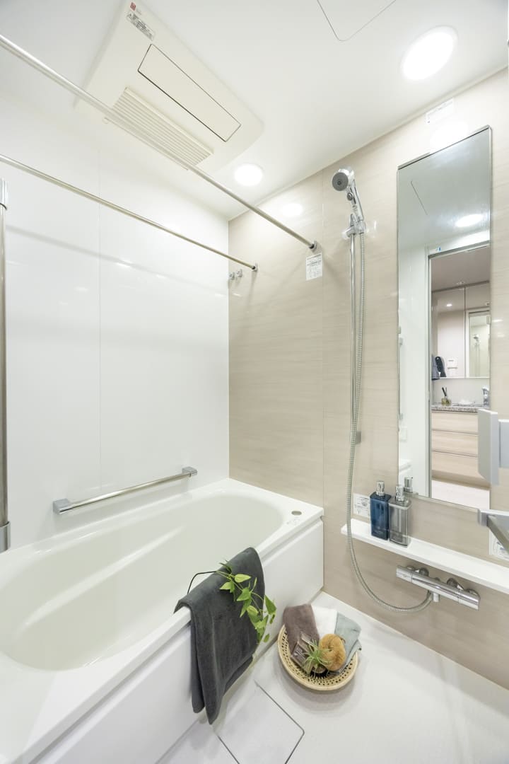 落ち着いた印象のバスルームです。お風呂にゆっくり浸かるのが好きという方に嬉しい追い焚き機能を搭載。家族の入浴時間がずれてしまっても安心です。また、浴室乾燥機には暖房・乾燥・換気・涼風の機能がついており、一年中快適に過ごすことができます。