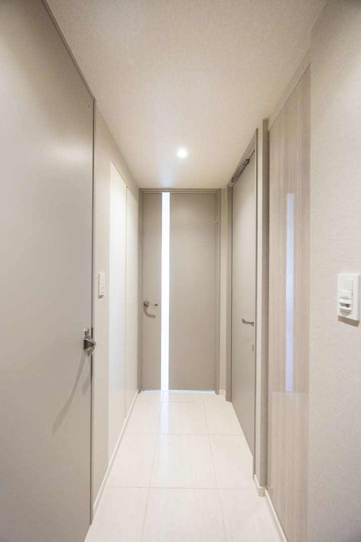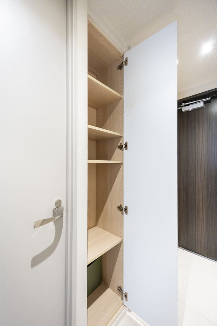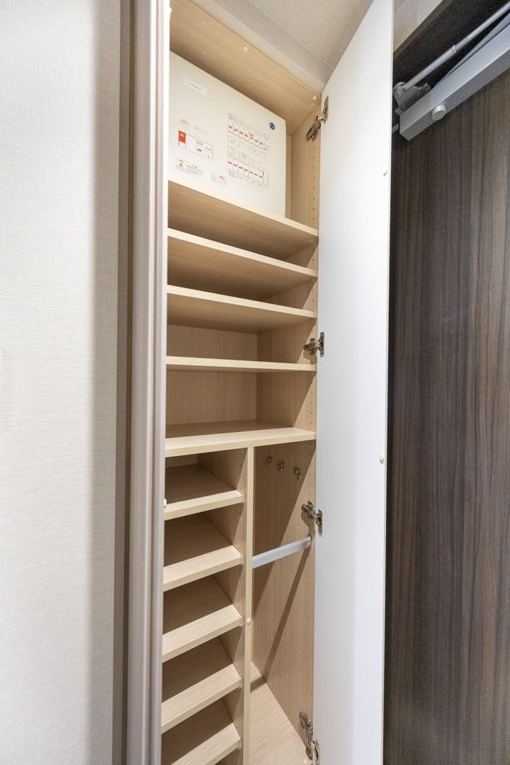 玄関には背の高いシューズボックスが備え付けられています。中には可動棚だけでなく、傘立てスペースもあって便利。さらに、廊下にも棚が造られているので、小物もきちんと収納できそうです。