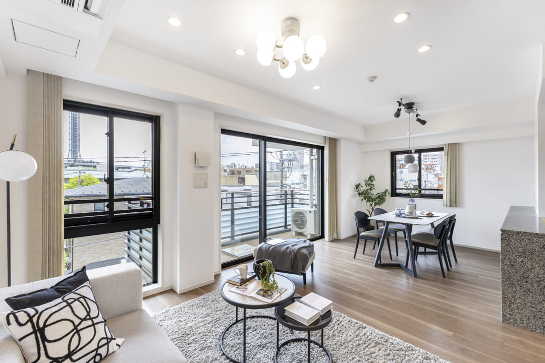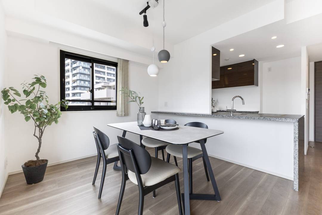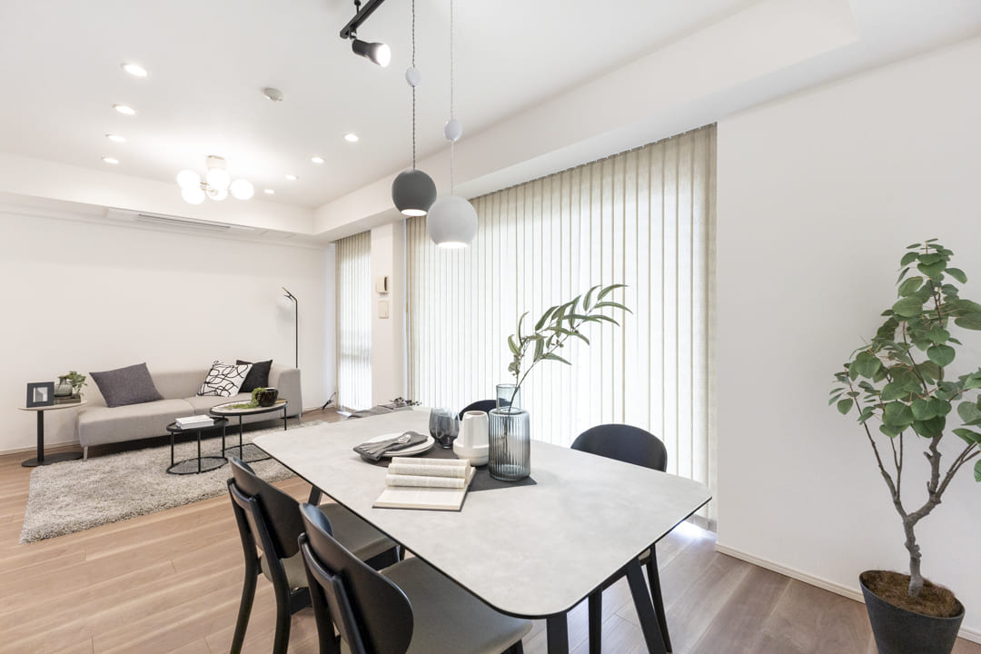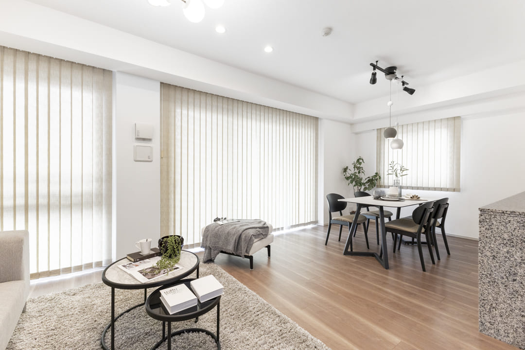 約15.6帖の広々としたリビングダイニング。南西・北西の二面採光により、心地よい陽光と爽やかな風が隅々まで届く住空間です。バルコニーに面した大きな開口部が、お部屋にさらなる奥行きと広がりをもたらします。白い壁紙に温かみのある木目調を合わせたナチュラルな内装は、どんな家具とも調和しやすく、自分らしいインテリアを愉しめるのも魅力です。