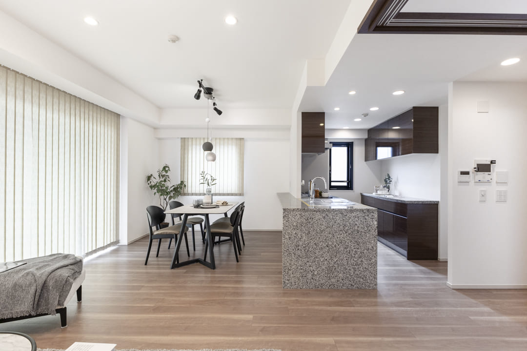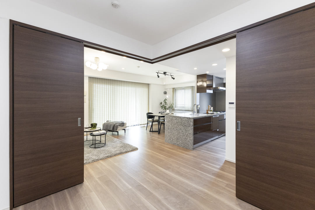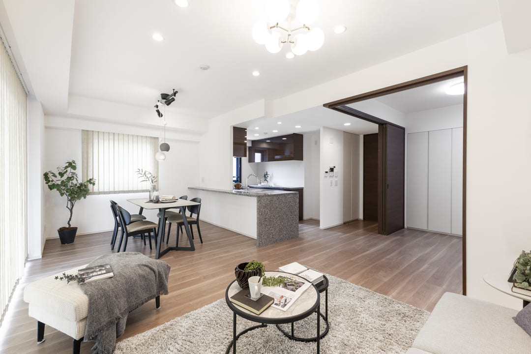 隣接する洋室3とは引き戸で仕切られていて、扉を開放すれば20帖超の一体空間として利用可能。普段は落ち着いたLDKとして、来客時や家族が集まるシーンでは開放感のある大空間として、ライフスタイルや用途に合わせた使い分けが叶います。