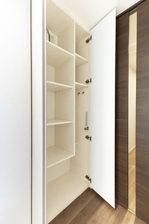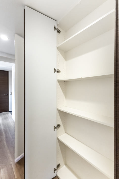 石目タイル貼りで落ち着いた印象の玄関ホール。窓から自然光が届き、明るく風通しの良い空間です。約0.9帖のSIC(シューズインクローゼット)を備え、収納充実。可動棚仕様のため、ロングブーツや雨具もすっきり収まります。廊下にも物入があり、日用品ストックやペットグッズの収納に重宝しそうです。