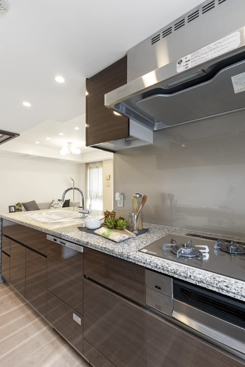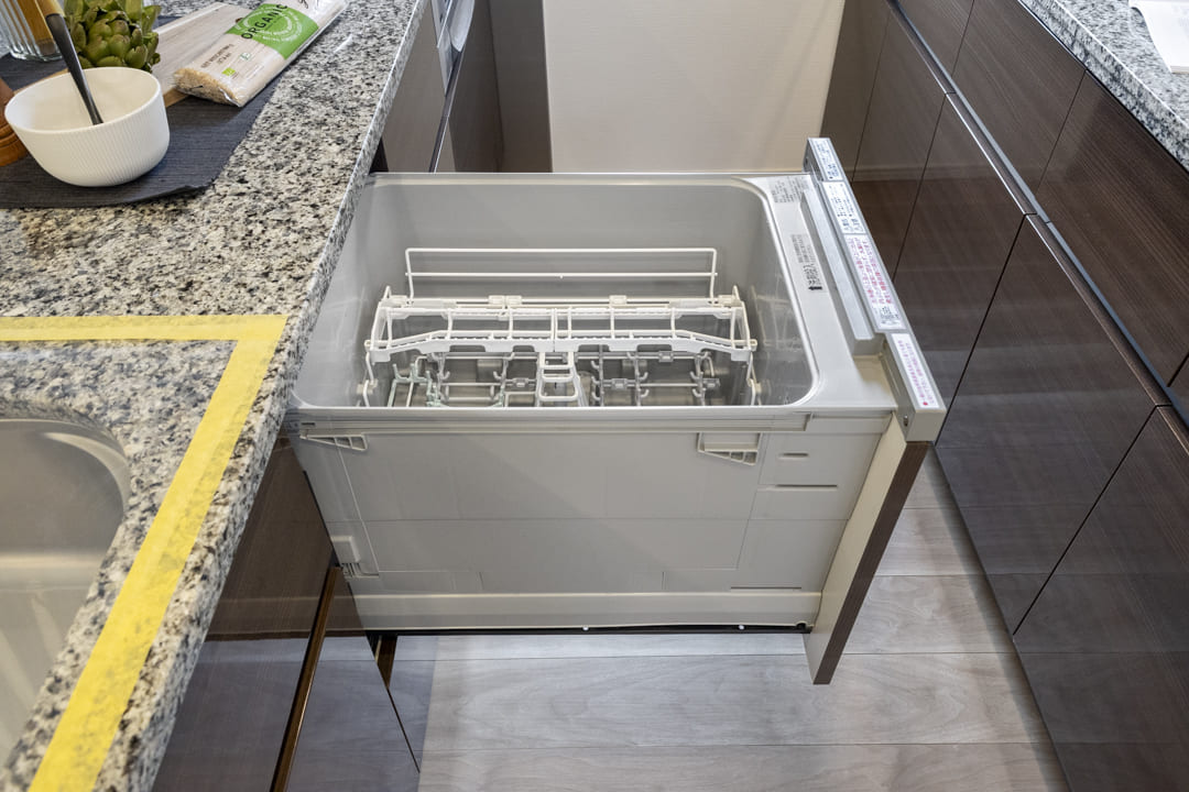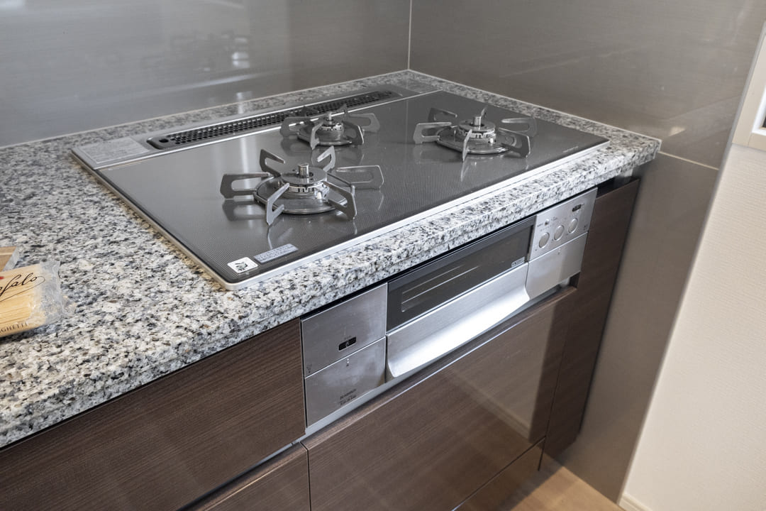 同時調理が叶うグリル付3口ガスコンロを内蔵。さらに、ディスポーザーと食洗機も完備されています。料理後すぐに生ゴミを処理できるので、悪臭の原因を防ぎ、掃除の手間を軽減。食器洗いも捗り、後片付けの時短が叶います。