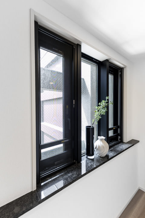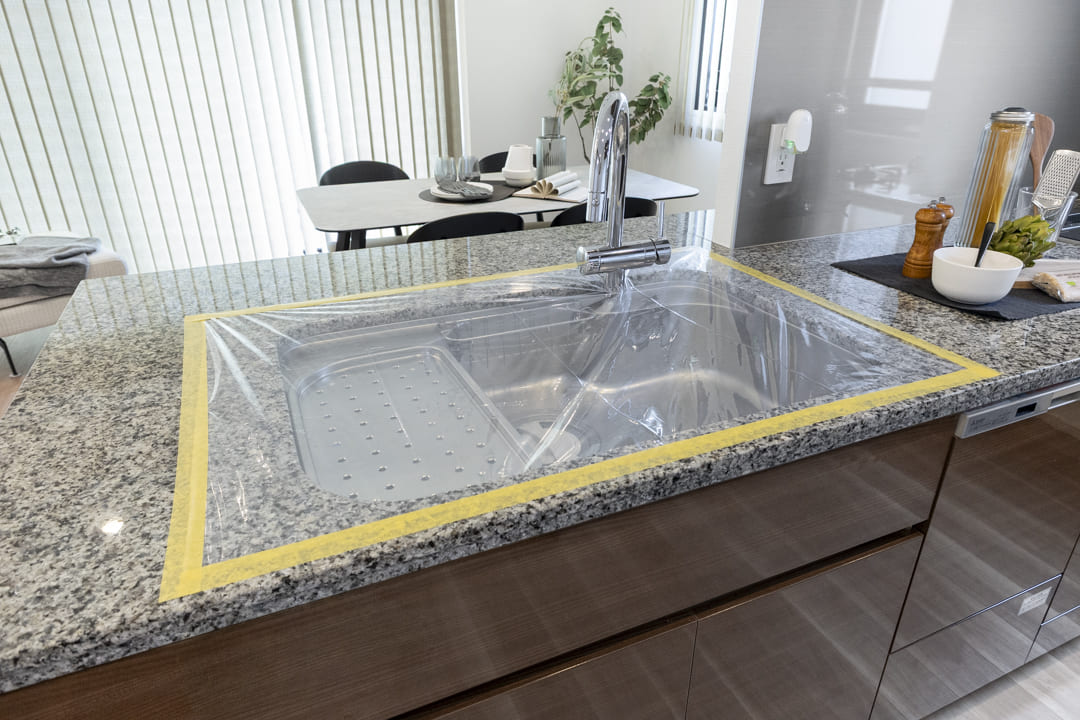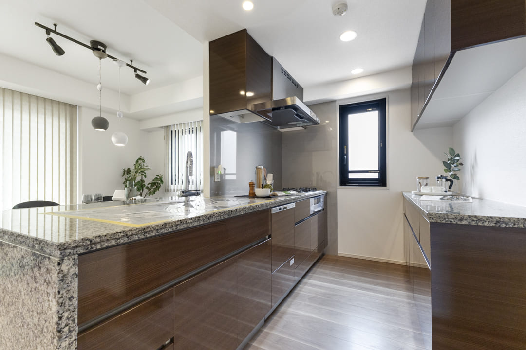約3.8帖のゆとりあるキッチンスペース。石目調のカウンターとダークカラーの面材を組み合わせた、落ち着きのある上質なデザインです。シンク側からはリビング全体を見渡せ、料理中も家族との会話が自然に弾みます。一方で、コンロ側は壁を設けることで、リビングへの油跳ねを抑え、空間を美しく保てる設計に。窓があり、調理中の煙やにおいをスムーズに換気できるのも嬉しいポイントです。
