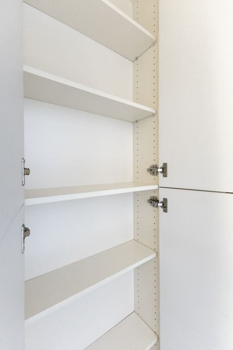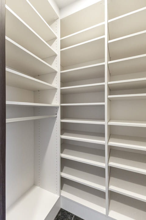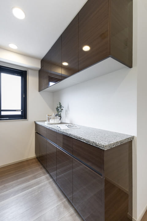 背面にはキッチンとデザインを揃えたカップボードを設置。統一感のある美しい空間を保ちながら、食料品や食器類をすっきり収納できます。カウンターは作業スペースとしても活用でき、日々の家事を快適にサポートします。
