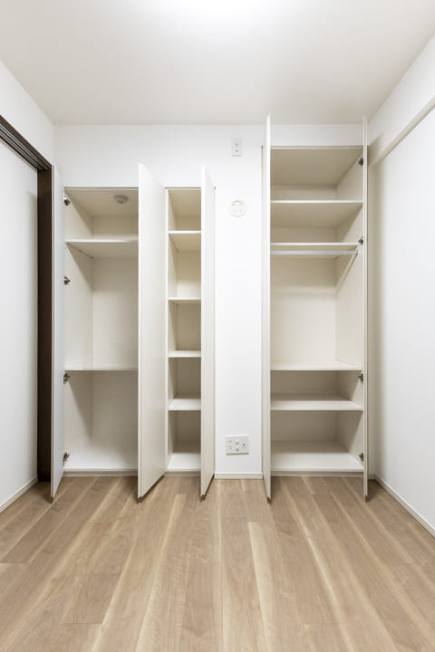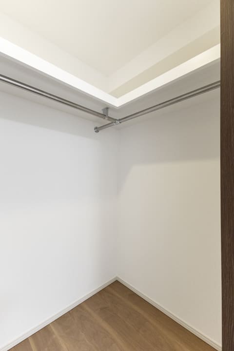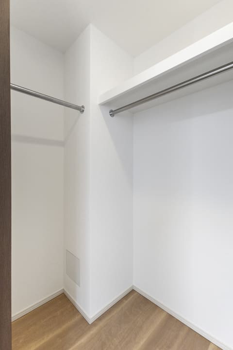 約8.0帖の洋室1。ゆとりある広さで主寝室におすすめです。二面の窓から心地よい風が通り抜け、一日を通して穏やかな時間が流れる空間。約1.6帖のWIC(ウォークインクローゼット)を備え、収納も充実しています。衣類はもちろん、トランクケースやゴルフバッグといった大きな荷物も収納でき、居室空間を有効活用できます。