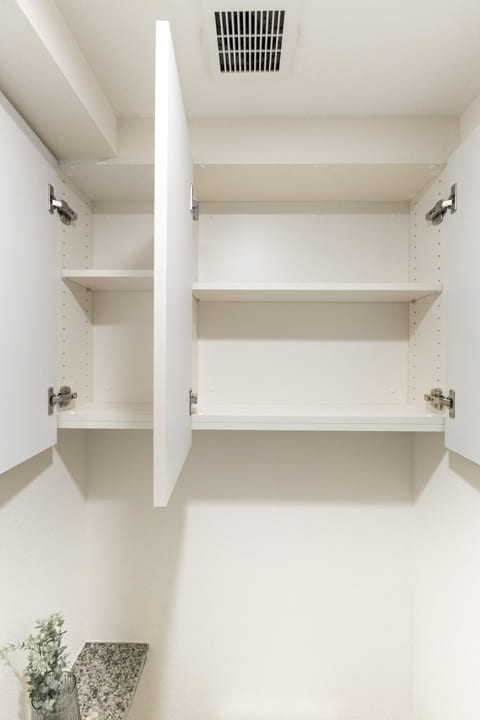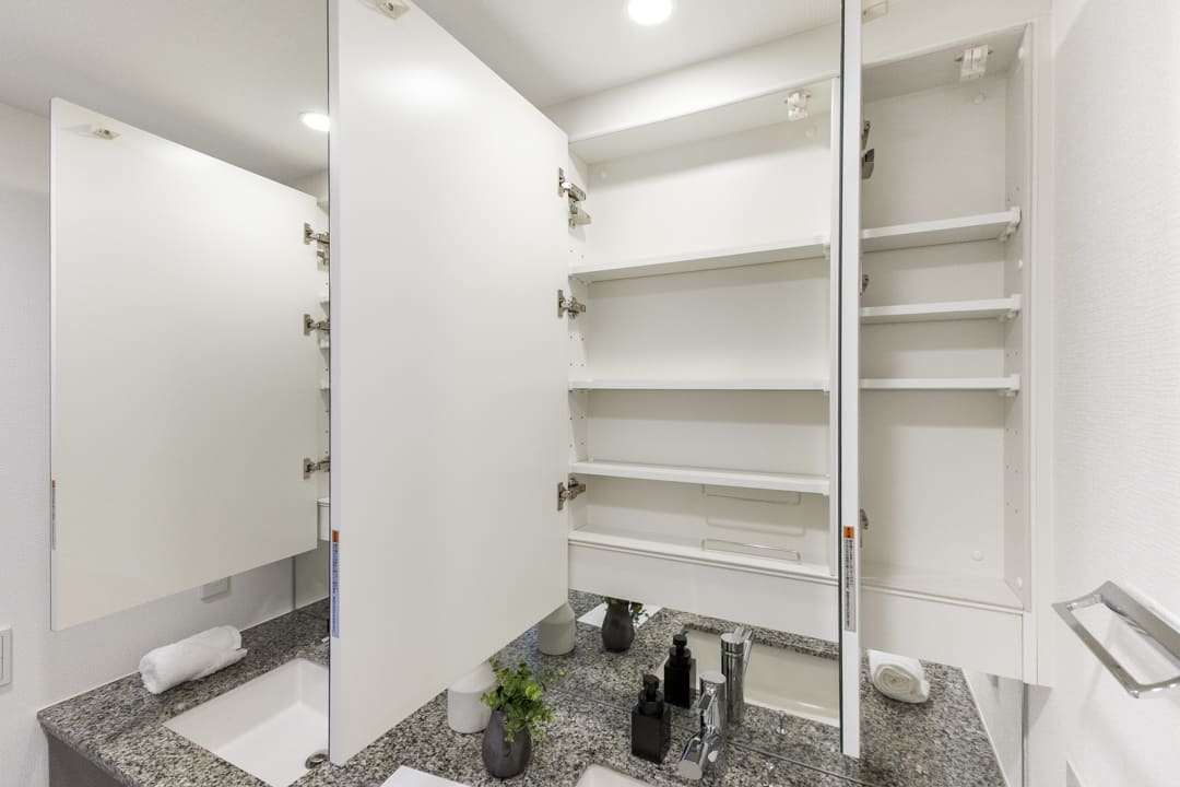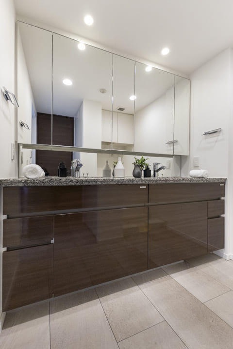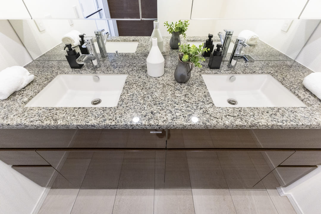 石目調カウンターを採用し、洗練された印象の洗面化粧台。ゆとりある2ボウル仕様です。2人並んで使用でき、忙しい朝の身支度にもゆとりが生まれます。ミラーボックスや足元の収納に加え、リネン庫も備わり収納豊富。いつも清潔な洗面室を保つことができます。