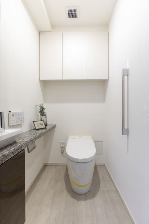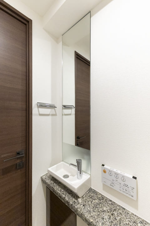 廊下に面していて独立性の高いレストルーム。TOTO製の洗浄機能付トイレを採用しています。タンクレス仕様でスタイリッシュ。独立した手洗いカウンターも備え、清潔感のある空間に整えられています。