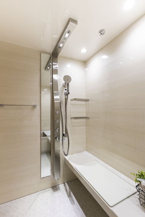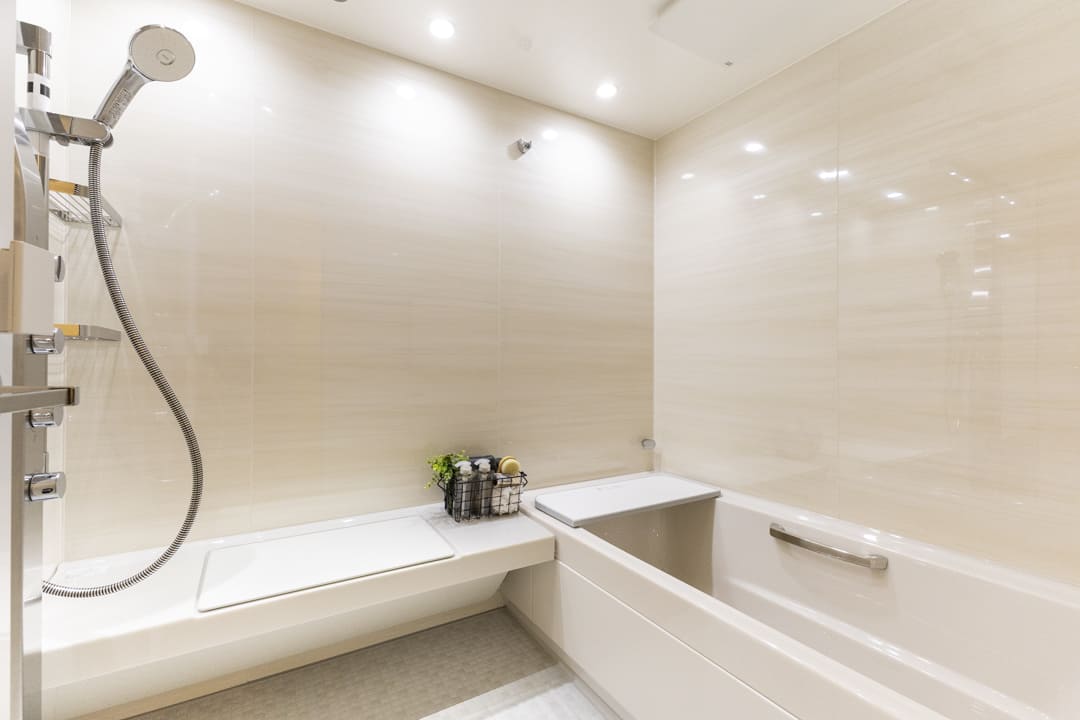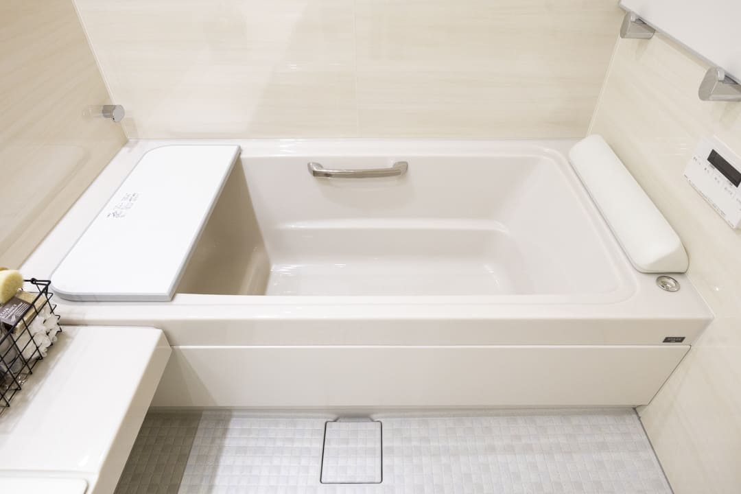 やわらかな木目柄デザインで落ち着いた印象のバスルーム。LIXIL製のスパージュを採用しています。換気・暖房・乾燥・涼風機能付きで1年中快適なバスタイムに。雨天時の洗濯乾燥や湿気対策にも配慮された仕様です。追い焚き機能も備えており、家族の入浴時間がずれた際や半身浴を楽しみたい時にも便利です。オーバーヘッドシャワーが設置されているので、全身でシャワーを浴びることができ、高い保温効果が期待できます。