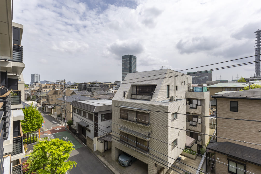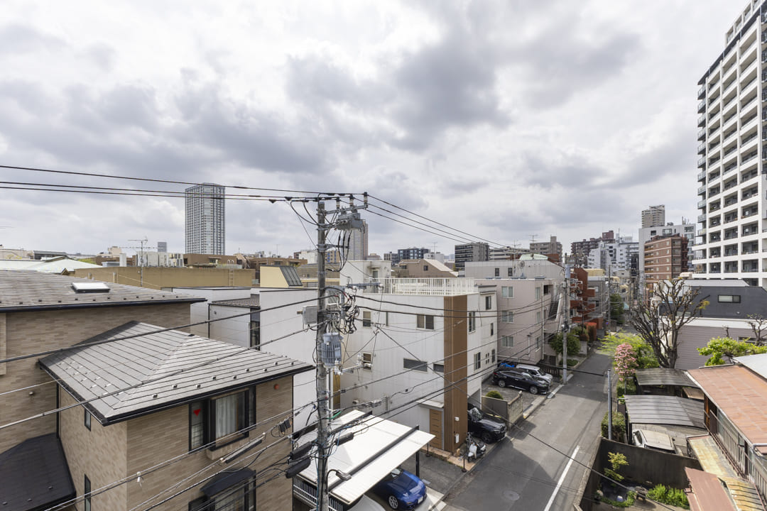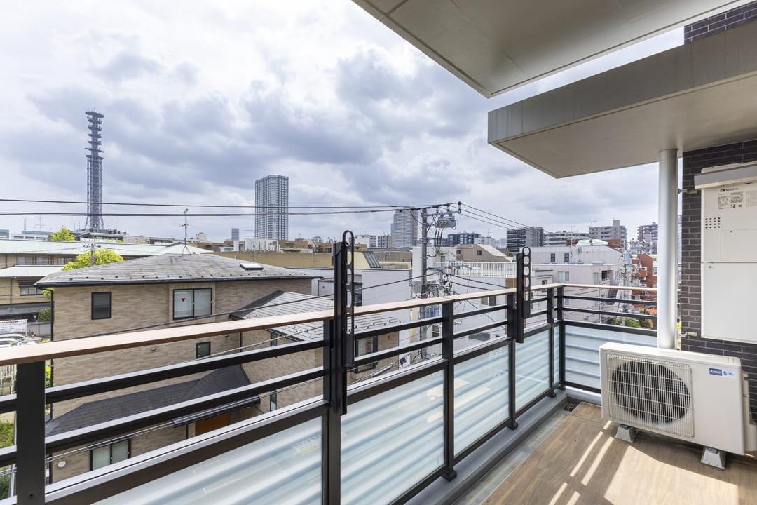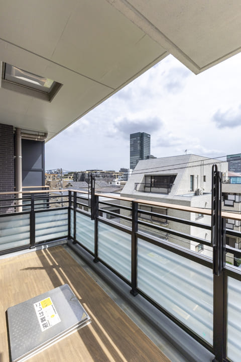 リビングダイニングに面するバルコニー。南西向きで日当たり良好です。晴れた日には洗濯物がよく乾きそうですね。周辺には低層の建物が多く、4階部分ながら開放感のある見晴らし。遠く広がる空を見渡し、ちょっとした気分転換やリフレッシュの場としても重宝しそうです。