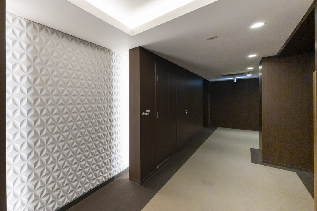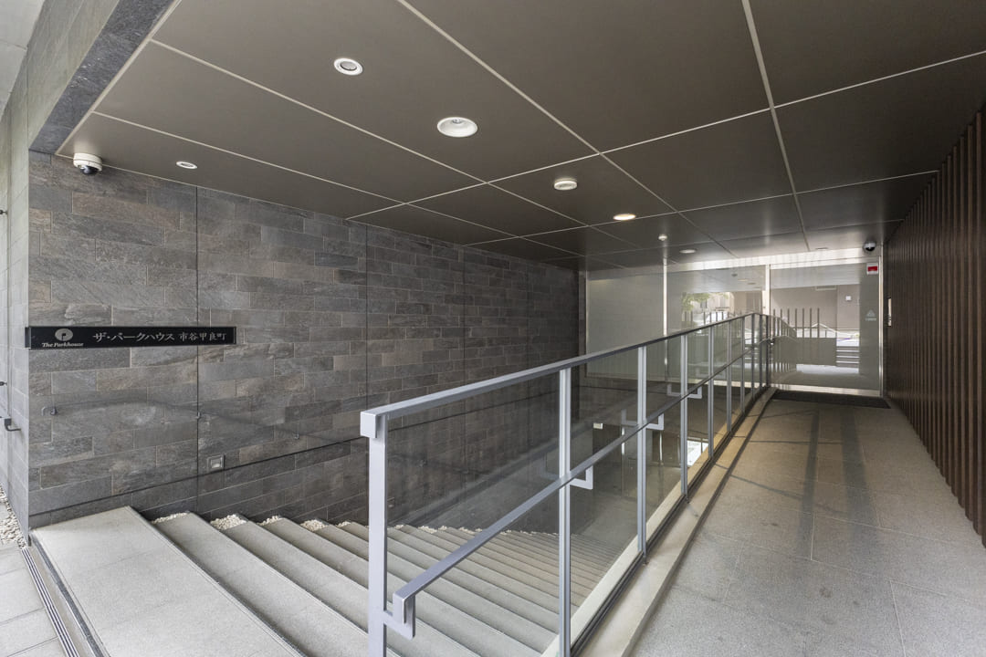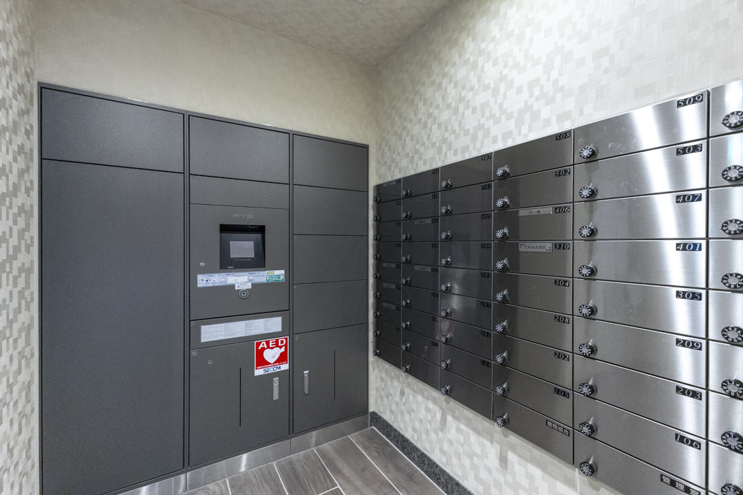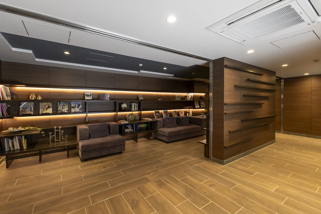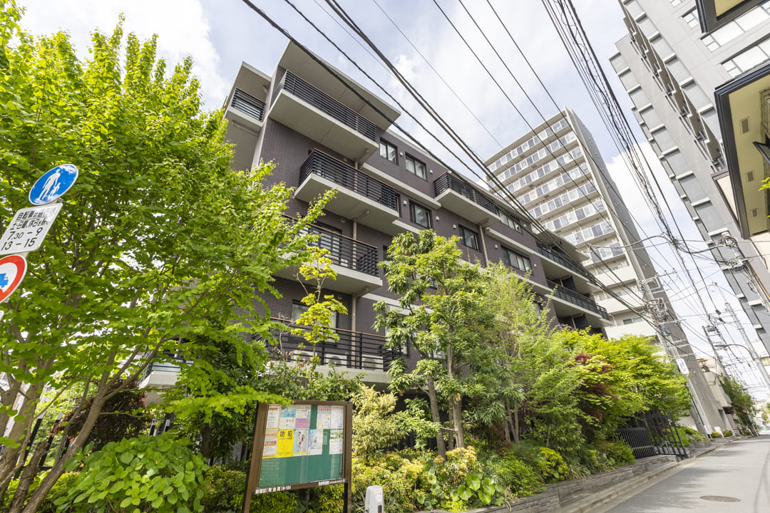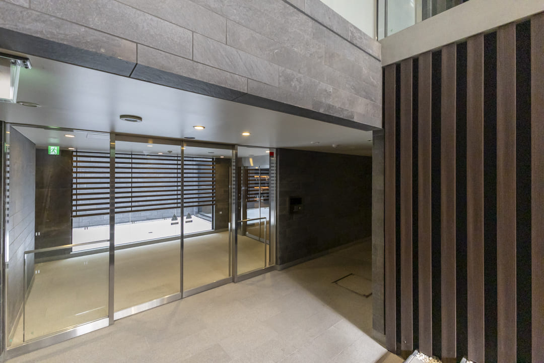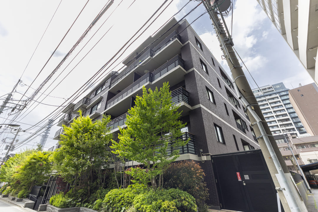 2017年(平成29年)1月竣工、ブラウン系タイル貼りの重厚感漂う外観が印象的なこちらのマンション。植栽の鮮やかな緑が彩りを添えています。鉄筋コンクリート造地下1階付地上5階建、総戸数は49戸です。安心のオートロック体制に加え、エントランスは階段を降りたアプローチの先に配置。道路からの視線が届きにくく、高い防犯性とプライベート感を確保しています。共用部にはライブラリーラウンジがあり、読書や休憩など思い思いの時間を愉しめます。宅配ボックスやペット飼育可(細則有)など、現代のライフスタイルに寄り添う設備も充実しています。