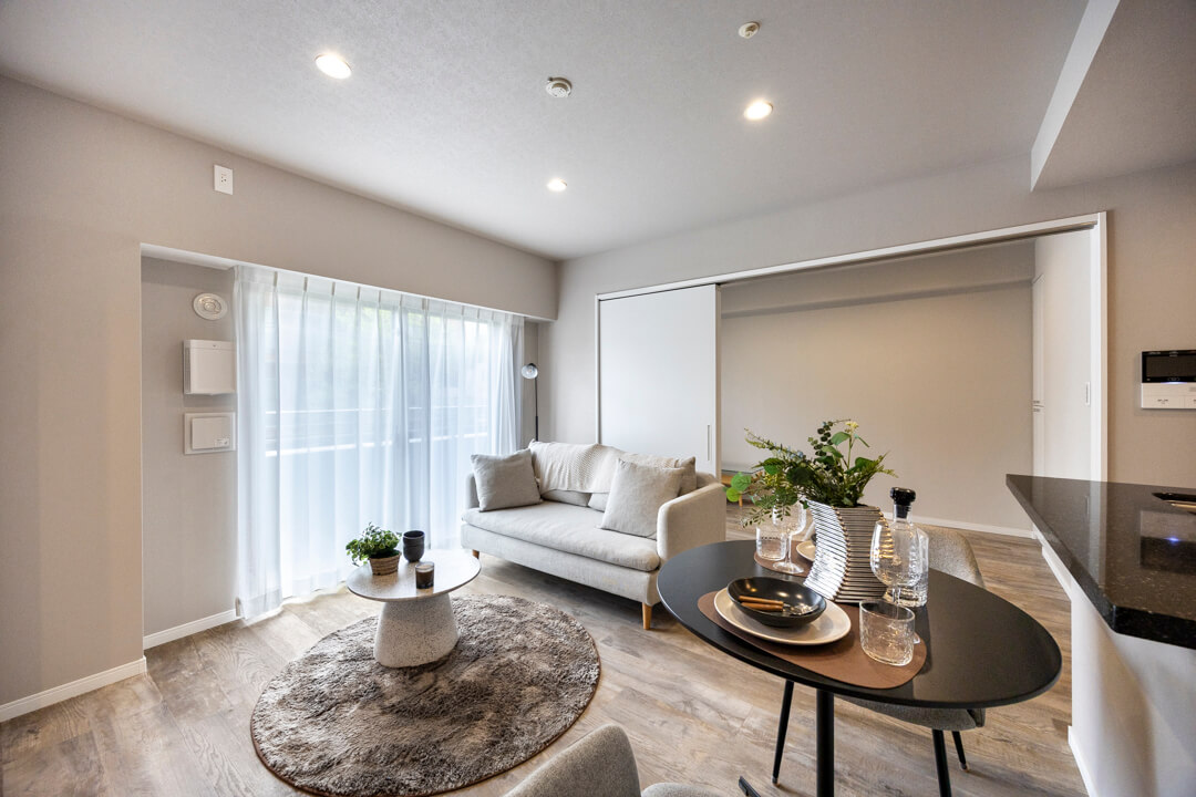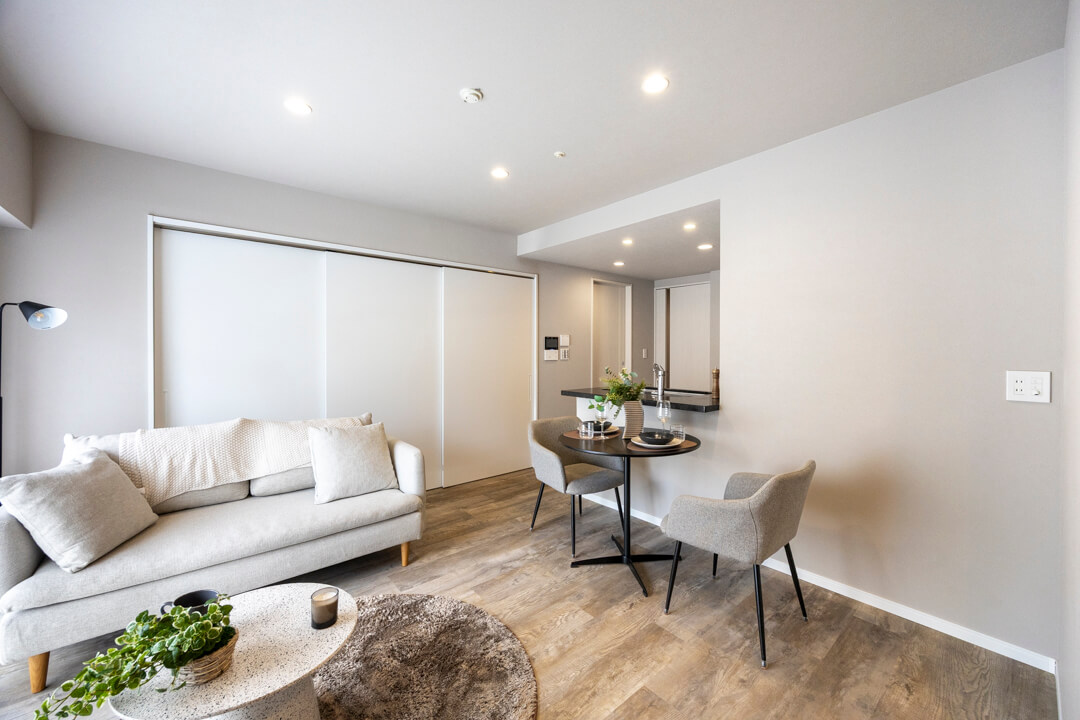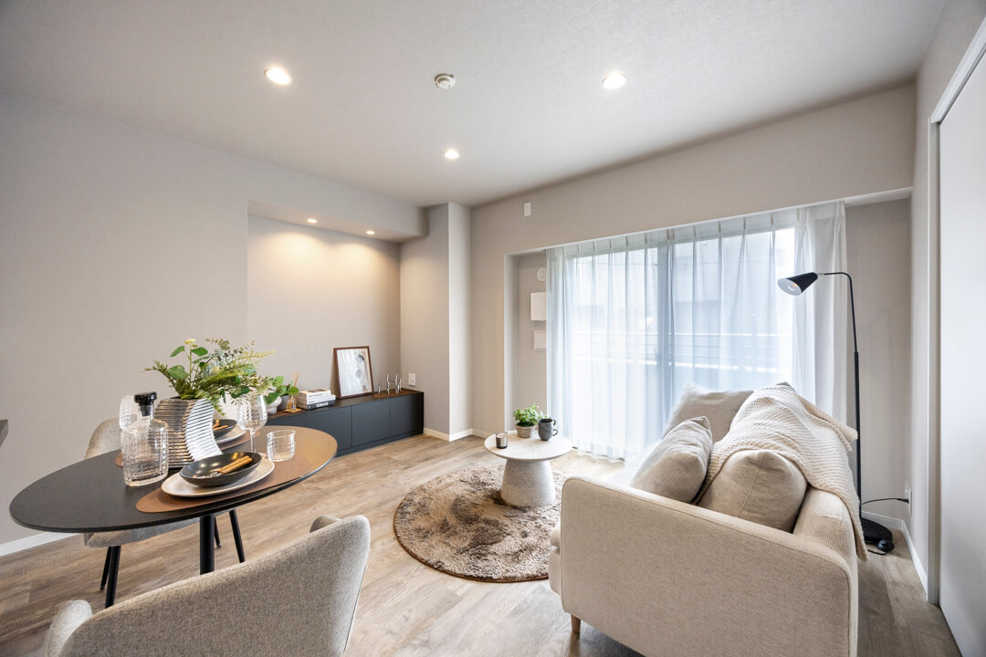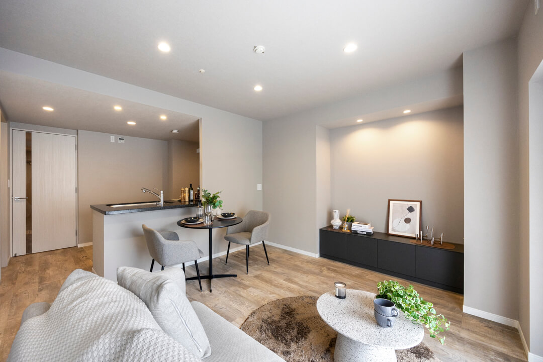 キッチンスペースを含め、約13.7帖のLDK。ほんのりグレー色のクロスで落ち着きのある印象です。方角は自然な光が入る南東向き。バルコニーも付いています。壁のくぼみにぴったりと収まった備え付けのTVボードは、扉付きの収納スペースも完備。また、隣接した洋室と繋げて広々と過ごすことも可能です。ライフスタイルに合わせて様々な使い方ができる便利な間取りとなっています。