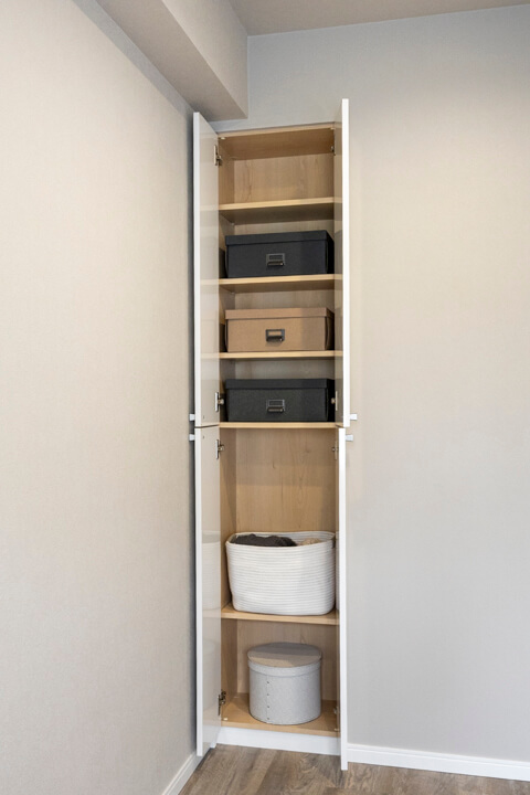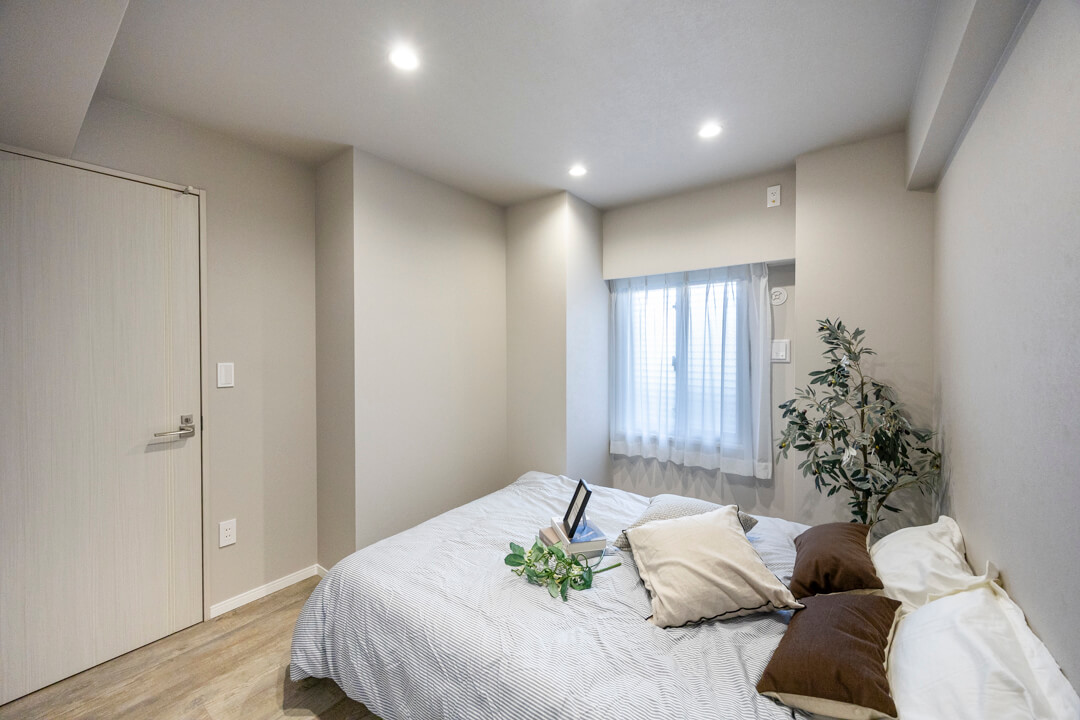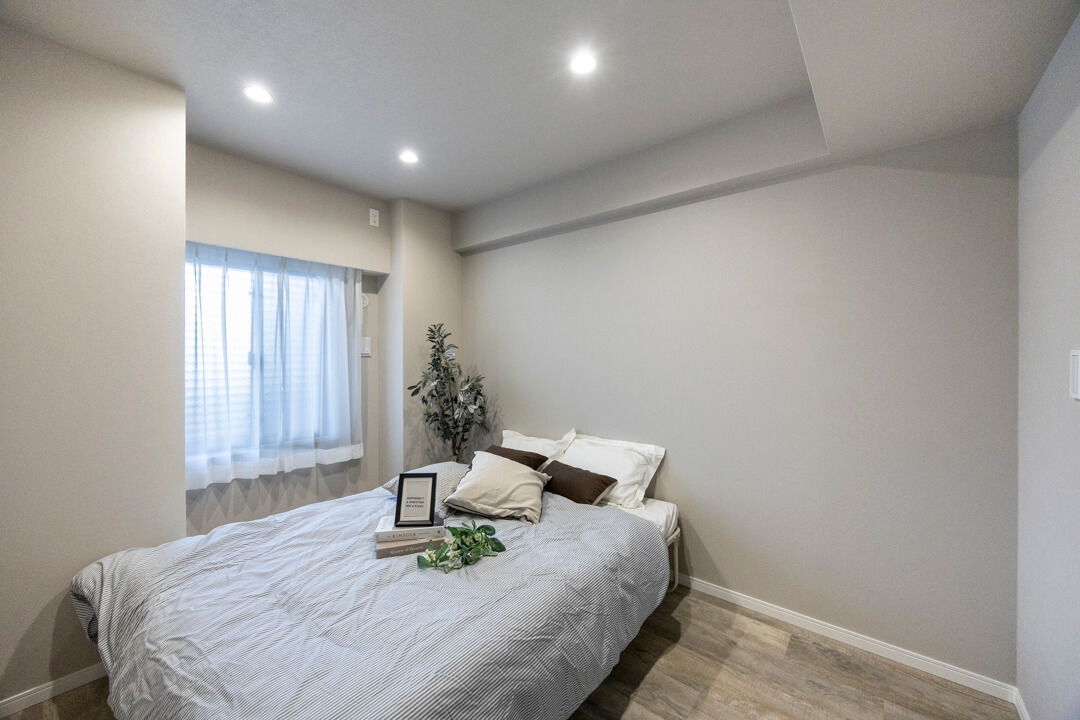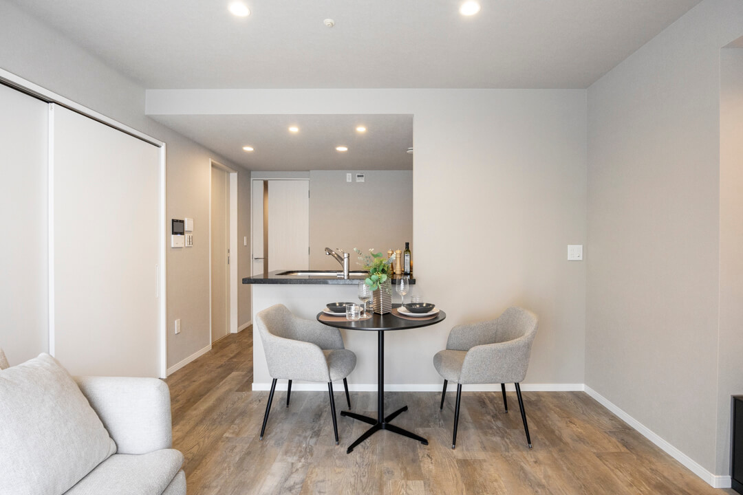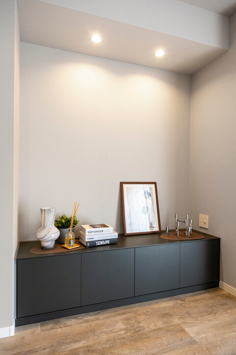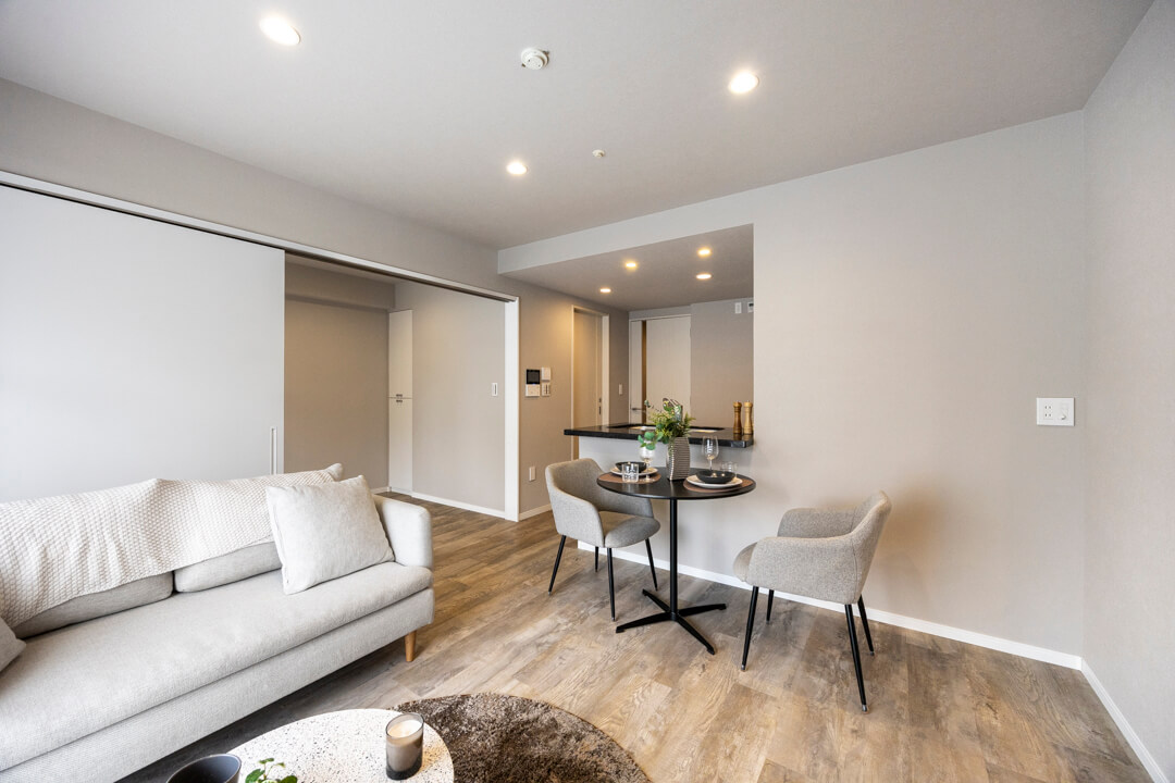 キッチンスペースを含め、約13.7帖のLDK。ほんのりグレー色のクロスで落ち着きのある印象です。方角は自然な光が入る南東向き。バルコニーも付いています。壁のくぼみにぴったりと収まった備え付けのTVボードは、扉付きの収納スペースも完備。また、隣接した洋室と繋げて広々と過ごすことも可能です。ライフスタイルに合わせて様々な使い方ができる便利な間取りとなっています。