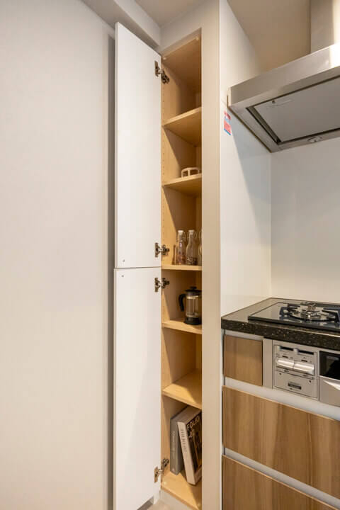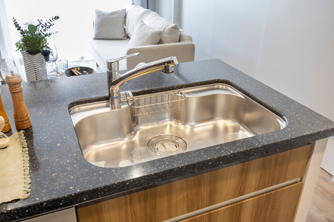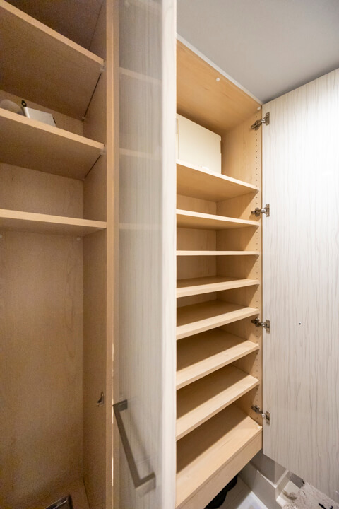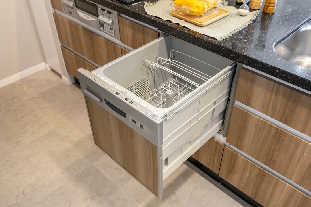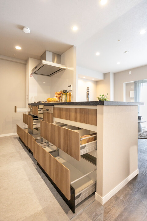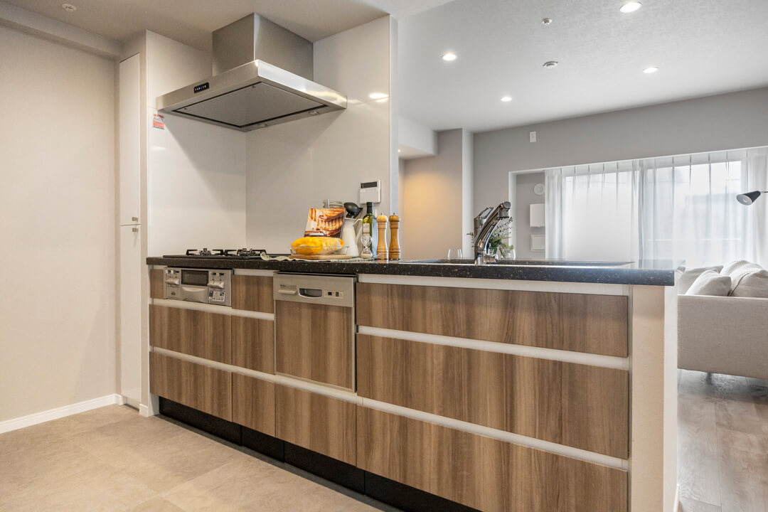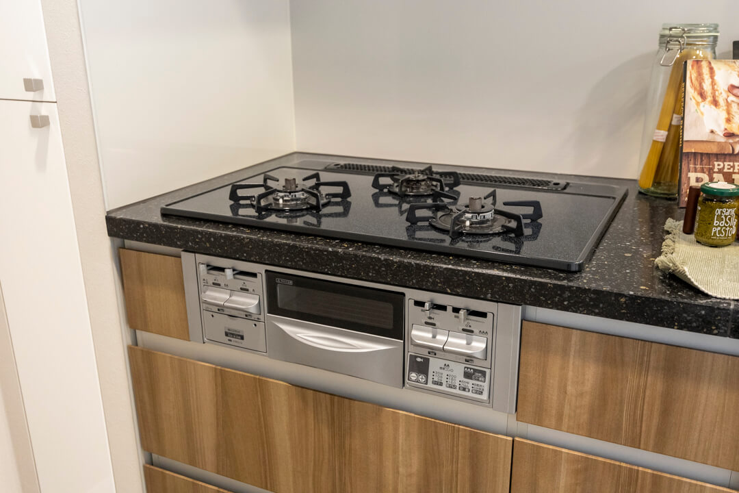 家族やゲストとコミュニケーションが取りやすいセミオープン型のシステムキッチン。小さなお子さんがいるご家庭では子どもの姿も見守れます。料理が捗る3口ガスコンロ、家事の時短に心強い食洗機、生ごみの処理に便利なディスポーザー付きで設備も充実。コンロ横にはパントリーも設けられています。