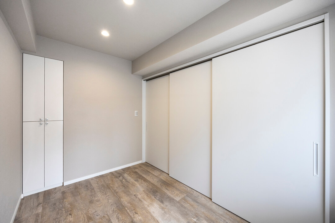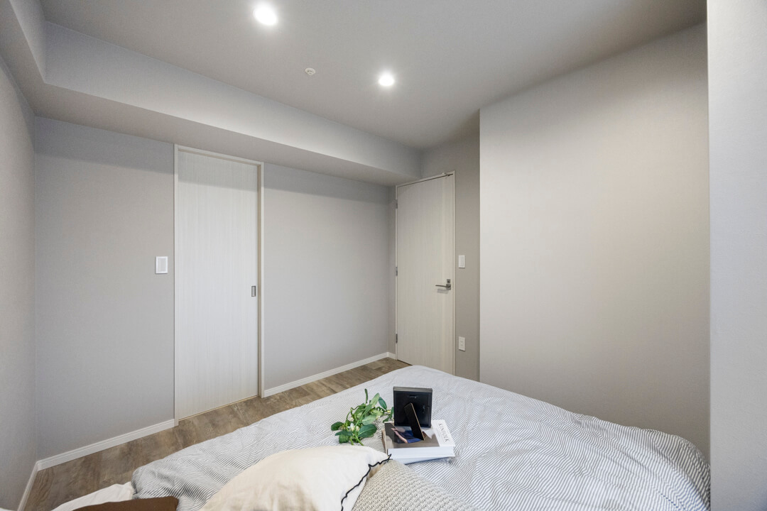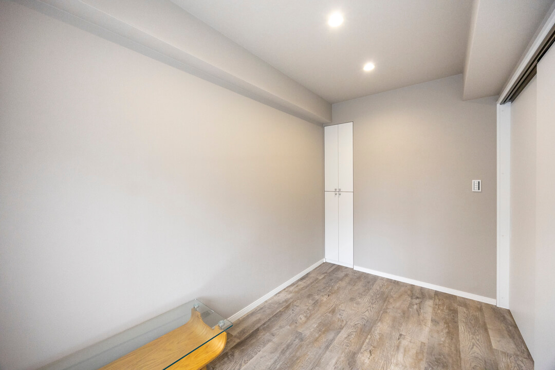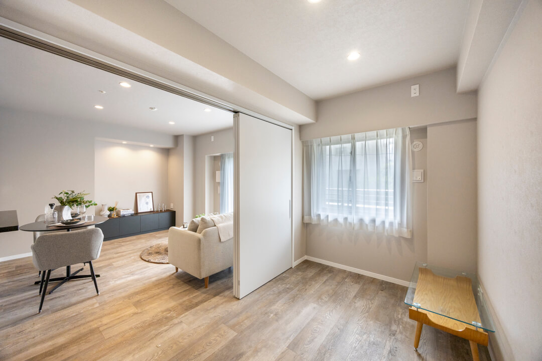 約4.4帖の洋室。リビングダイニングと繋げて広々過ごすことも可能。床にドアレールがないので見た目もすっきりとした印象です。ワークスペースや趣味部屋などにも使いやすいお部屋です。