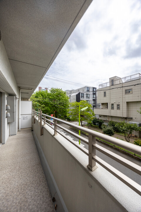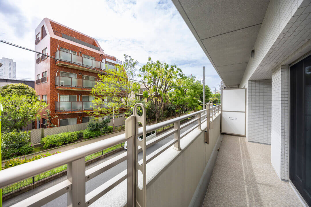 リビングダイニングと洋室に面したバルコニー。約8.95㎡程の広さです。南東向きで陽当りも良好。目の前の建物とは距離が保たれており見晴らしが良くなっています。