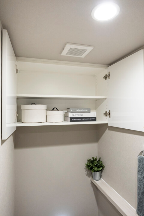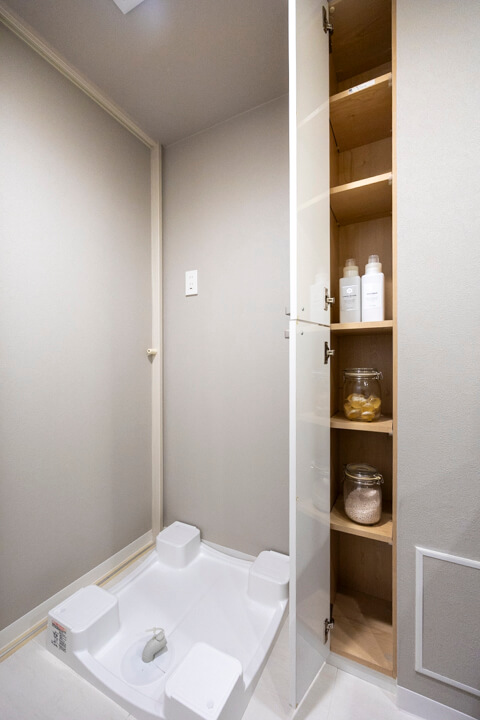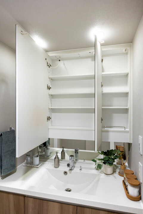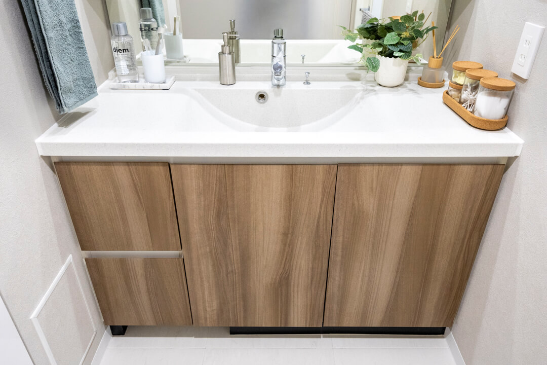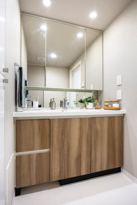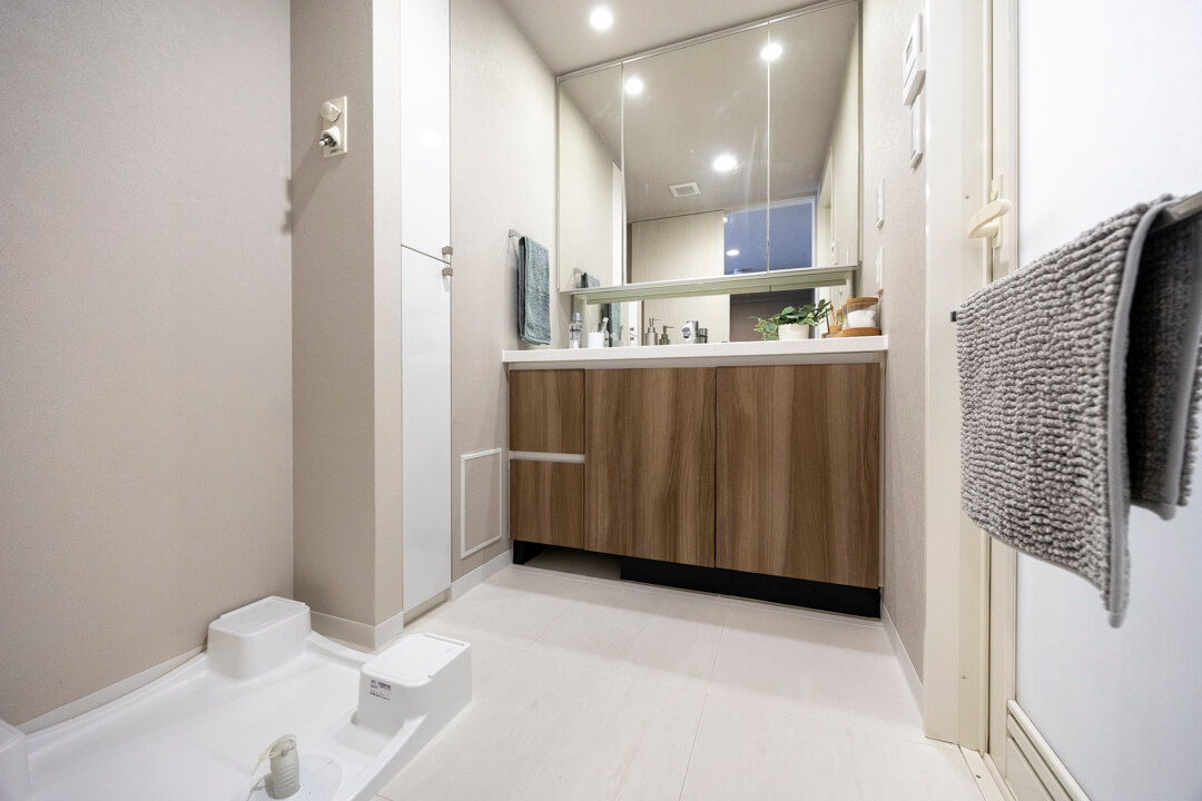ウッド調であたたかみのある雰囲気の洗面化粧台。洗面まわりの小物がすっきり整頓できるミラーボックス付きでいつでも整った状態をキープできそうですね。洗濯機置き場の隣にはリネン庫も設けられています。