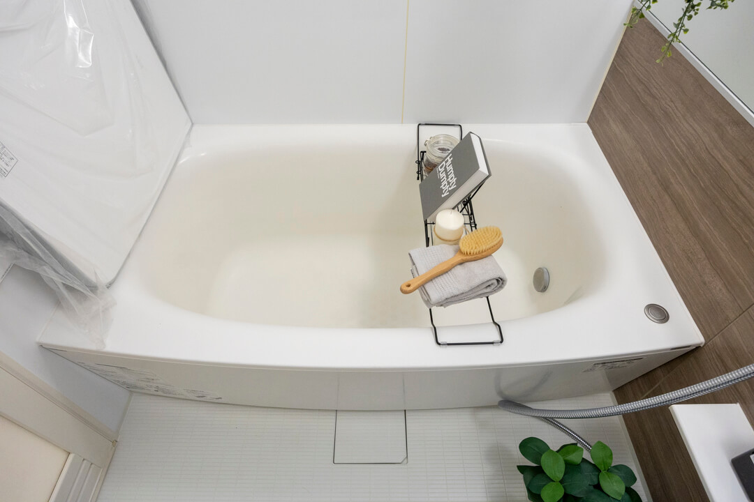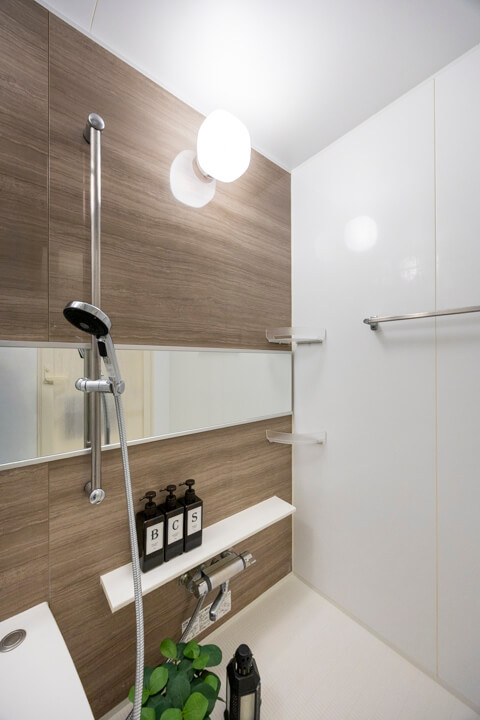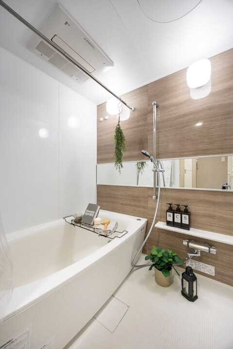 1418サイズのバスルーム。ウッド調のアクセントパネルであたたかみのある雰囲気です。追い炊き機能の他、乾燥・換気・暖房・涼風の4つの機能が備わっていて、一年中快適にバスタイムが楽しめます。ランドリーパイプ付きで雨の日や冬場の洗濯にも困りません。