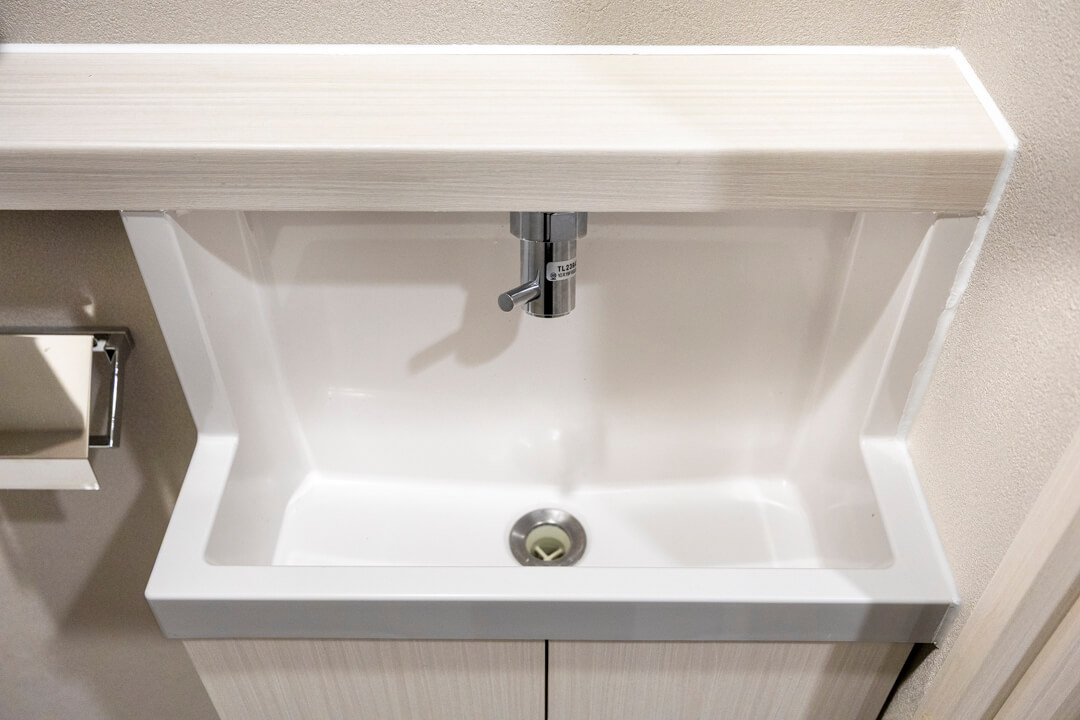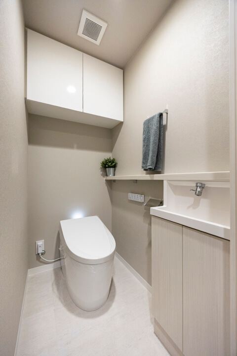 廊下に面したレストルーム。空間がすっきり見えるタンクレストイレです。独立型の手洗器、収納スペース、ウォシュレットも備わっています。