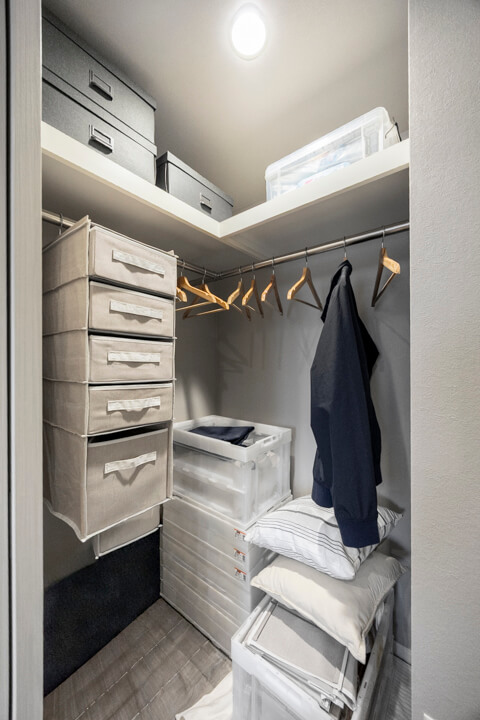 約6.0帖の洋室。廊下に面した独立性の高い空間で、自分時間をゆっくりと過ごせます。WIC(ウォークインクローゼット)はL字型にハンガーパイプが設置されていて、洋服がたっぷりと掛けられます。主寝室として使いやすいお部屋です。