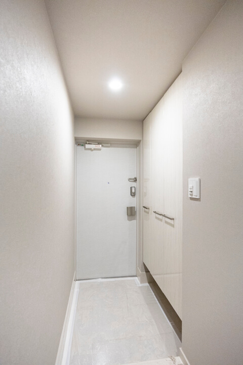 明るい印象を与えてくれるホワイトカラーで統一された玄関ホール。3枚扉のシューズボックス付きで、靴以外にも傘や小物類を収納できるスペースも備わっています。