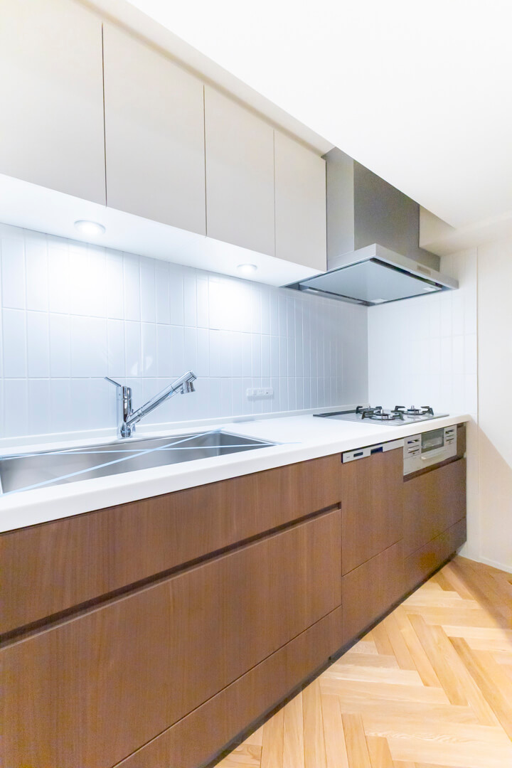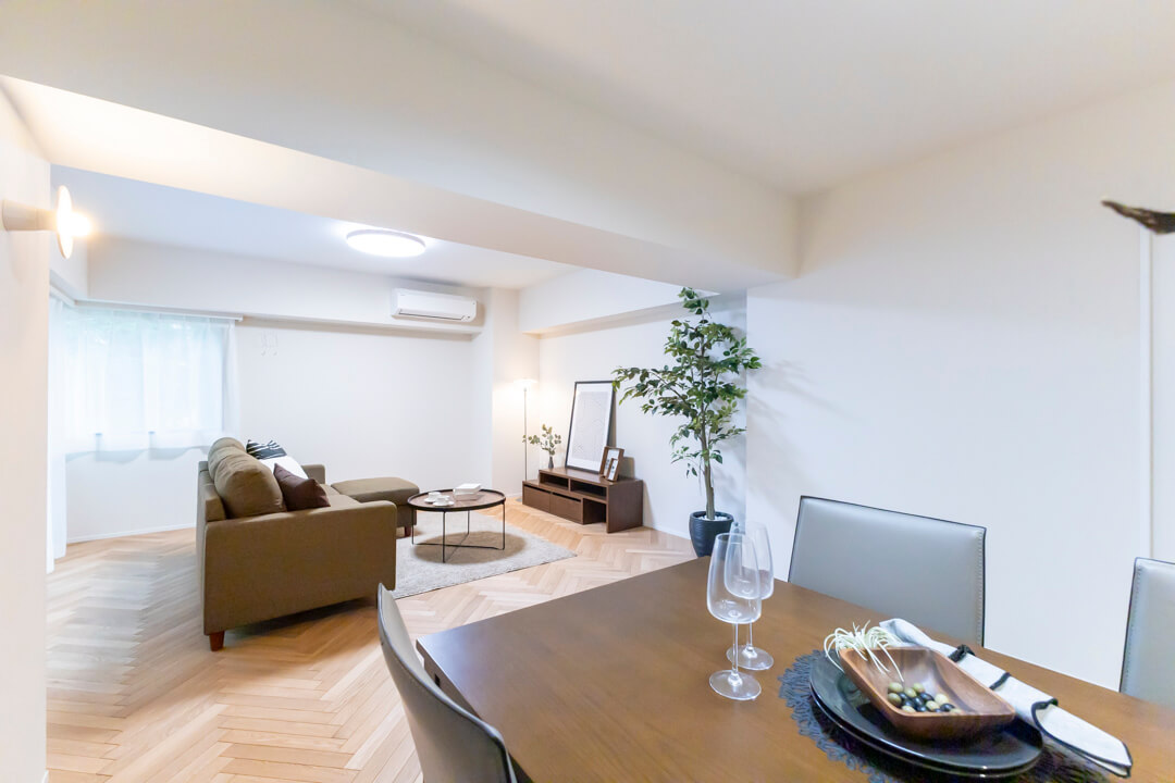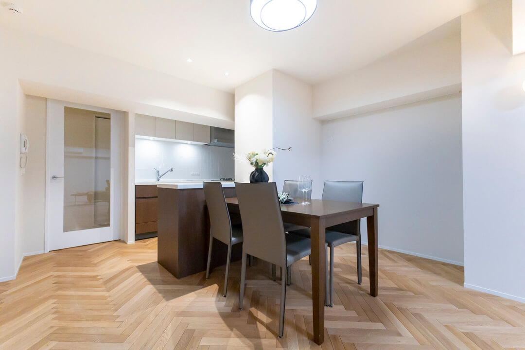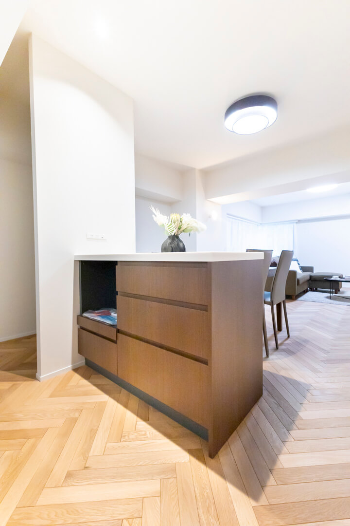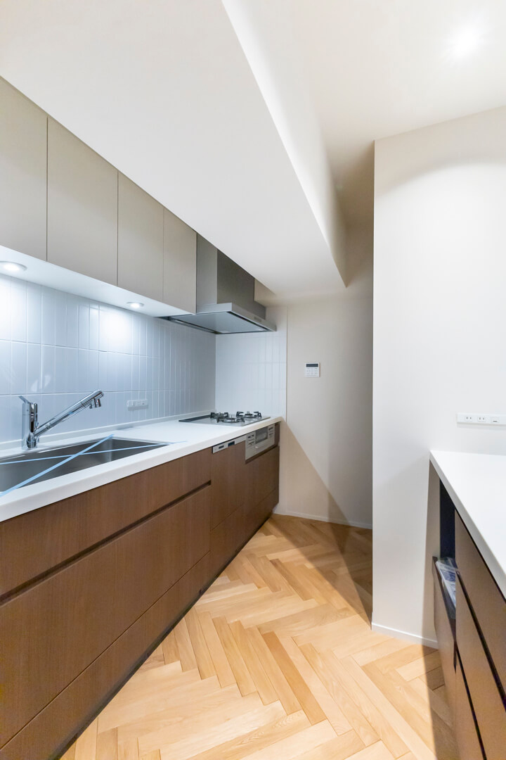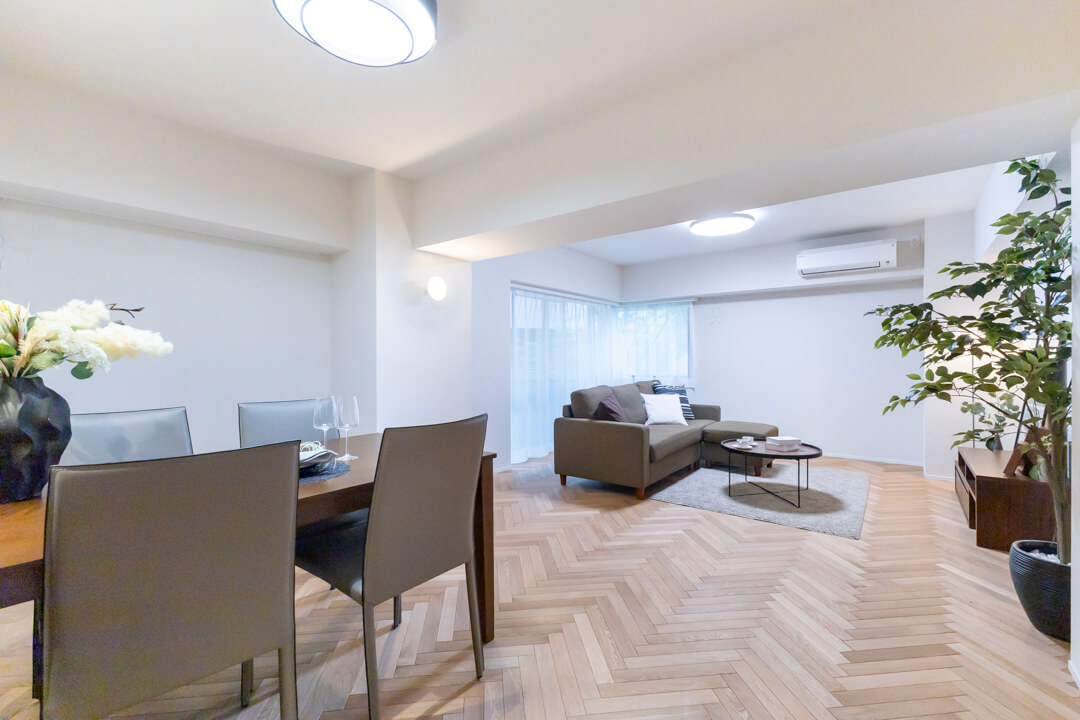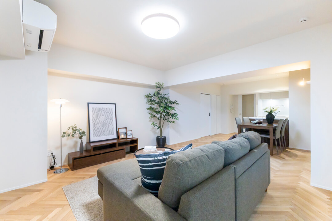 キッチンスペースを含め、約20.2帖のLDK。家族でゆったり過ごせる広さで、ホームパーティーも楽しめそうです。空間に奥行きと動きを与えてくれるヘリンボーンのフローリングが印象的。壁にはピクチャーレールが設置されていて、キズをつけずにアートや写真が飾れます。また、リビングの一角には収納スペースも備わっています。