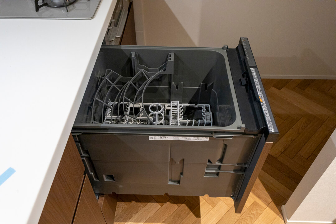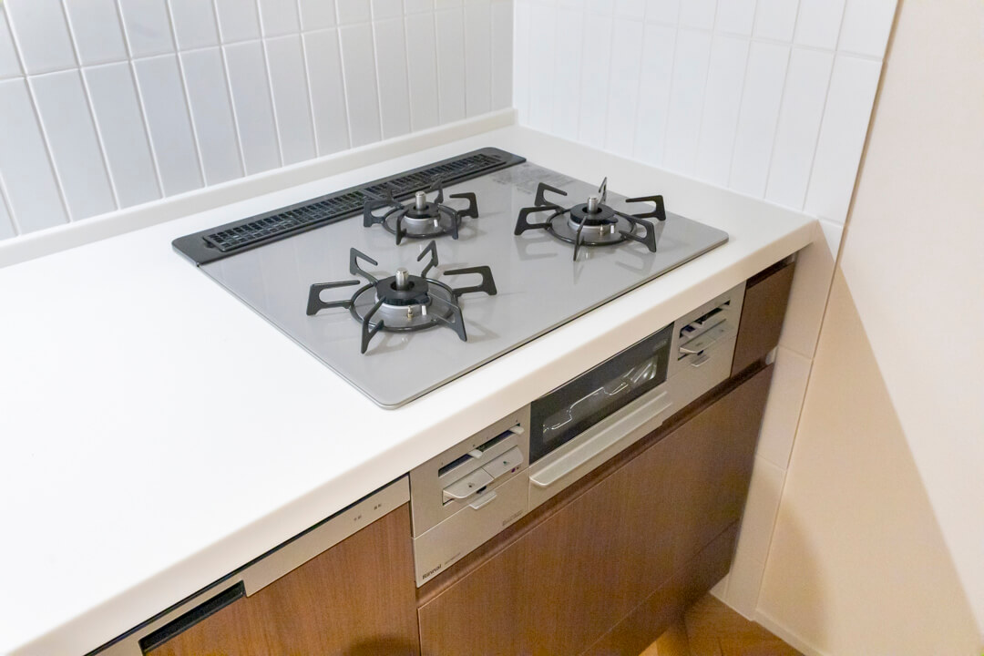 木目調のシンプルなシステムキッチン。料理が捗る3口ガスコンロ、家事の時短に心強い食洗機付きです。カウンター収納(カップボード)も備わっています。
