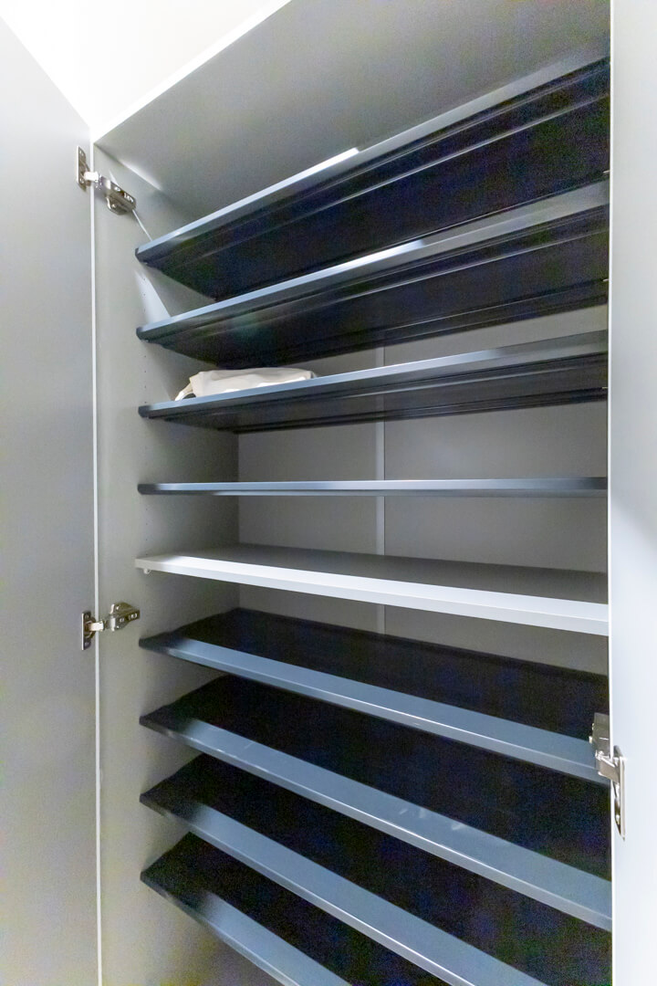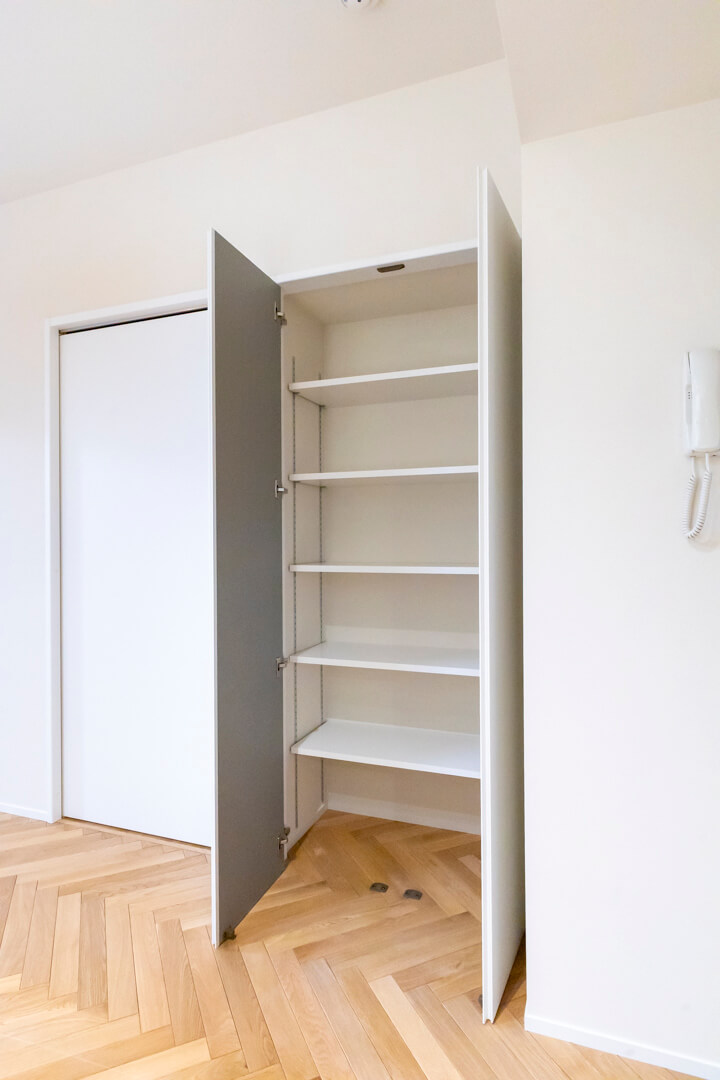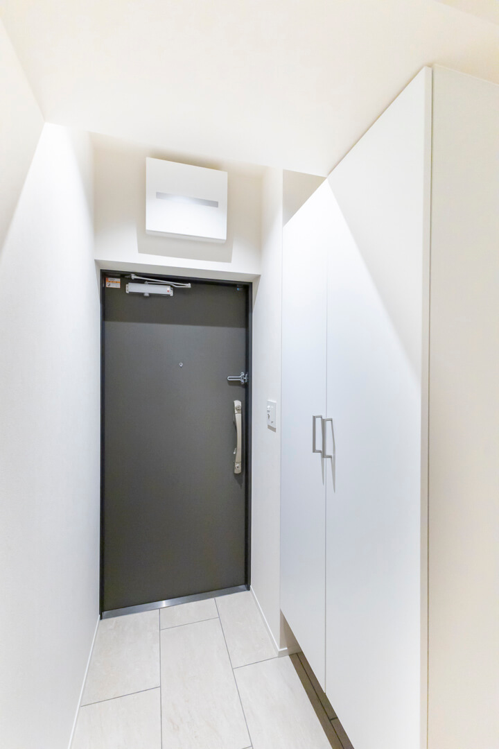 玄関には2枚扉のシューズボックス付きで靴がたっぷり収納可能。空間に明るい印象を与えてくれるホワイトカラーです。
