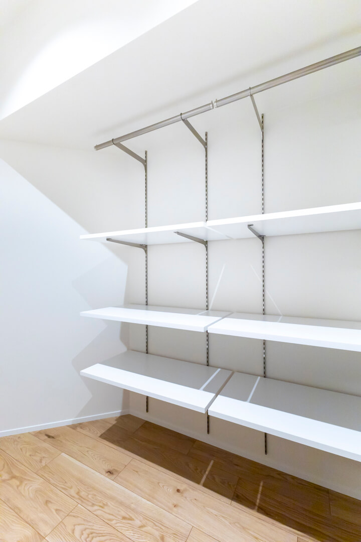 約7.0帖の洋室。リビングダイニングから直接出入りできる動線です。WIC(ウォークインクローゼット)にはバッグなど小物類の整頓にも便利な可動棚も設置されています。