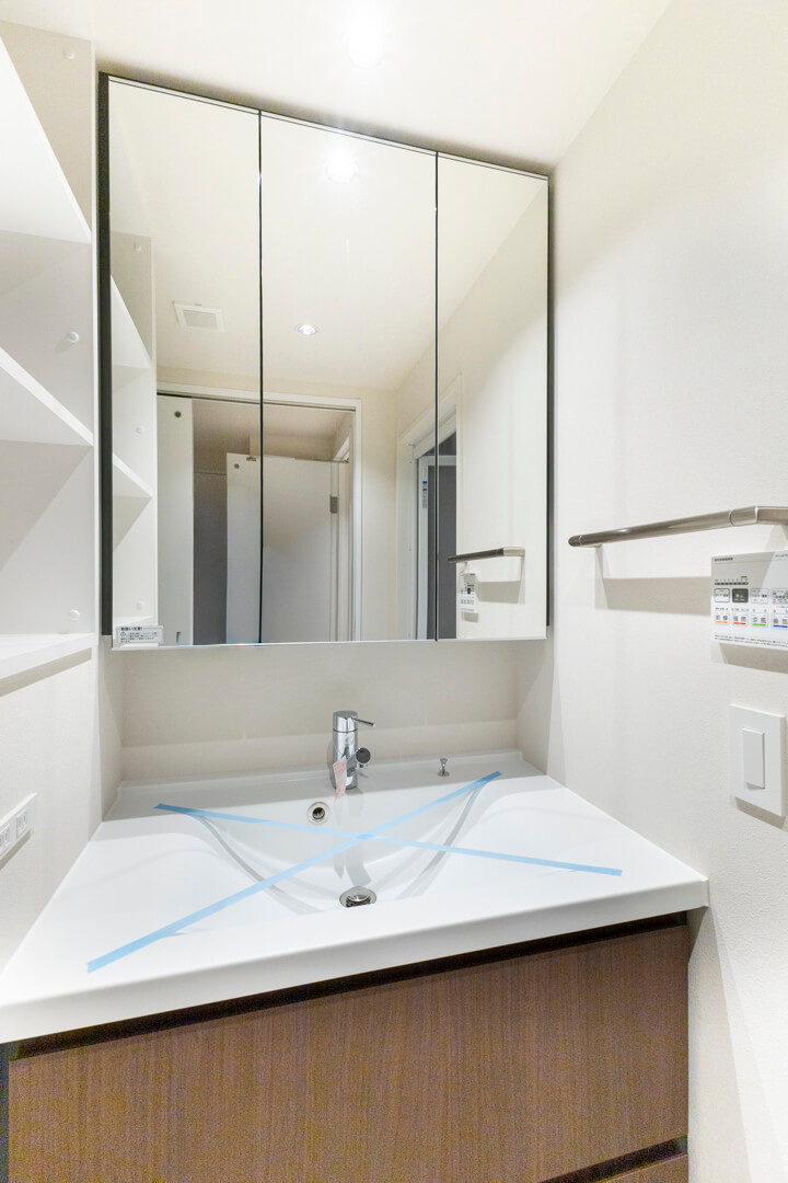 洗面化粧台は洗面まわりの小物がすっきり整頓できるミラーボックスや、モノの出し入れがしやすい引き出し式のキャビネットで使い勝手の良さもポイント。洗面台の左横には別途収納棚も設置されています。